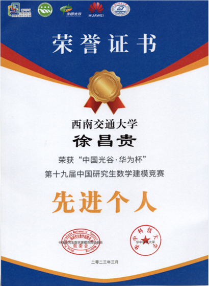 徐昌贵,男,副教授。从1998年至今,担任西南交通大学历届数学建模竞赛指导教师,指导学生共获得国家一等奖10项,国家二等奖14项,省奖26项。获得全国百名优秀数学建模指导教师荣誉,第十九届中国研究生数学建模“先进个人”荣誉称号。