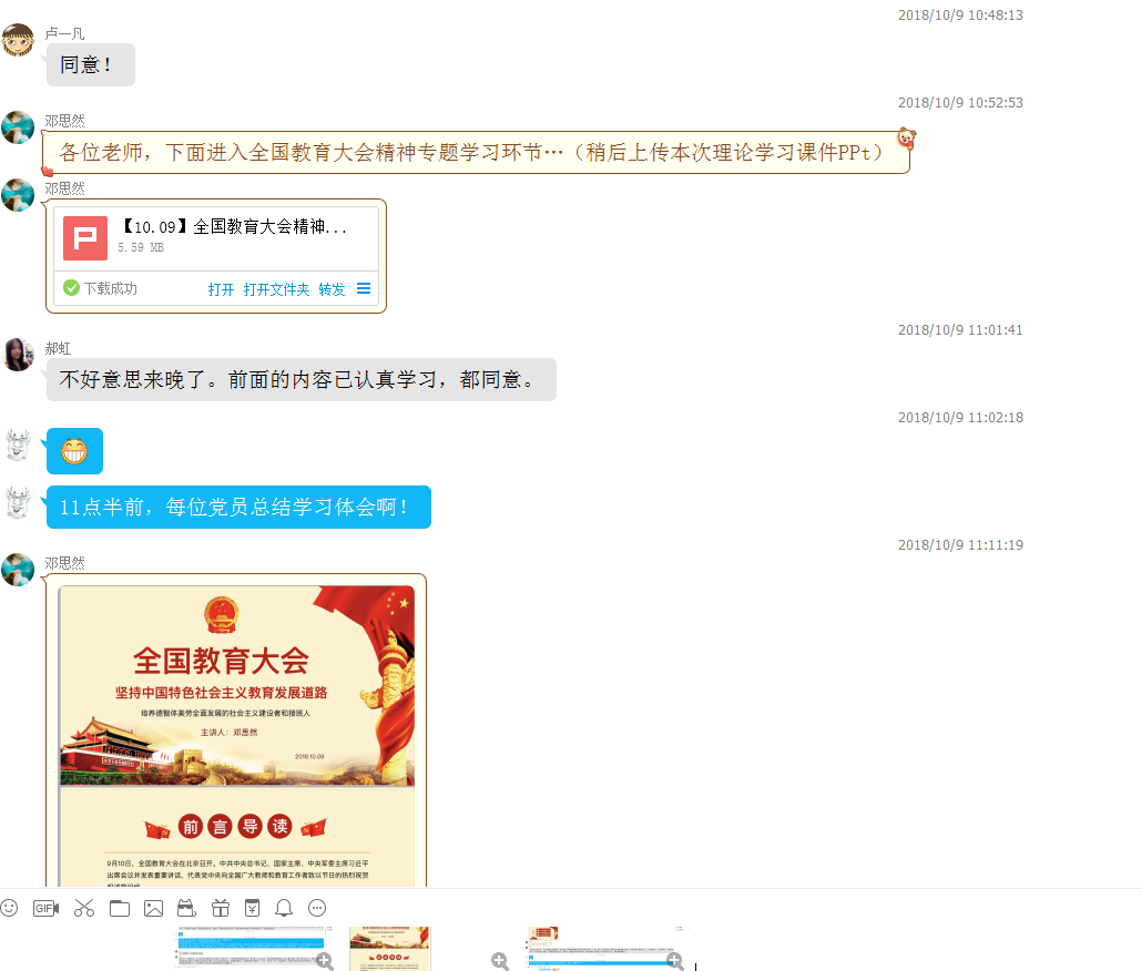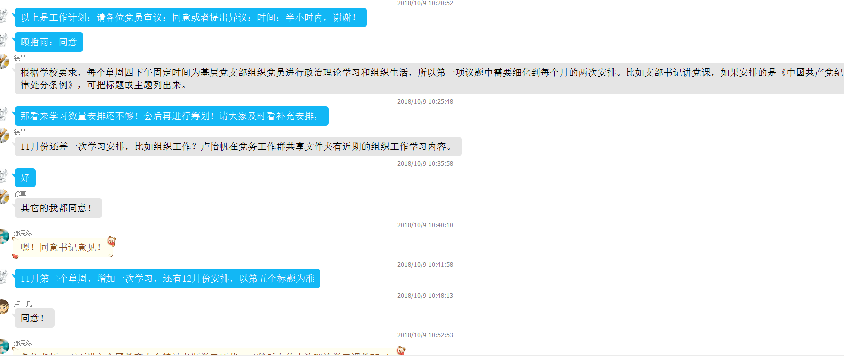 10月9号上午,机关党支部全体党员大会以网络形式,在机关QQ群中召开,这是机关党支部的一次有益尝试,由于机关党员目前因公或病不在校内人数较多,组织全体党员大会比较困难,为了基层党组织工作能够顺利进行,机关党支部打出了这样的口号:“人散群不散,一个也不能少”。经过支委们多次支委会讨论,完善了一整套会议要求和程序,致使这次党员大会得以顺利进行,他们首先要求按时网上报道,对每个议题提出意见和建议,对于学习要求拟写心得,党员们积极响应,按程序参与,为此次党员大会画上一个圆满的句号!