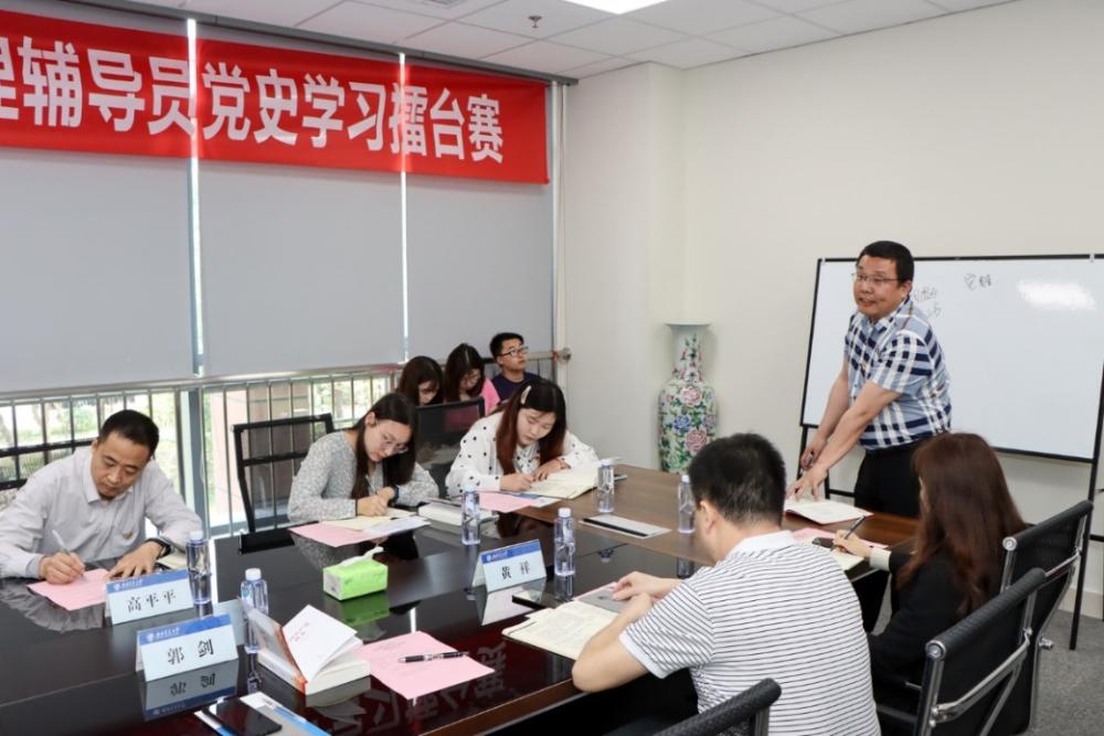 辅导员擂台赛形式和周周学、轮流讲、同讨论的方法,每周针对一章内容进行深入学习,选派一名辅导员老师畅谈学习体会并进行评分,要求在学习和讲述中不用电脑、不用手机、不用PPT,原原本本学党史,原汁原味讲体会,真正推进党史学习教育入脑入心。