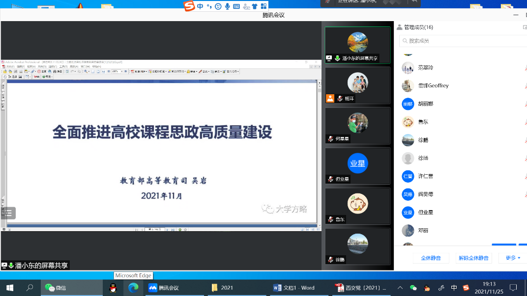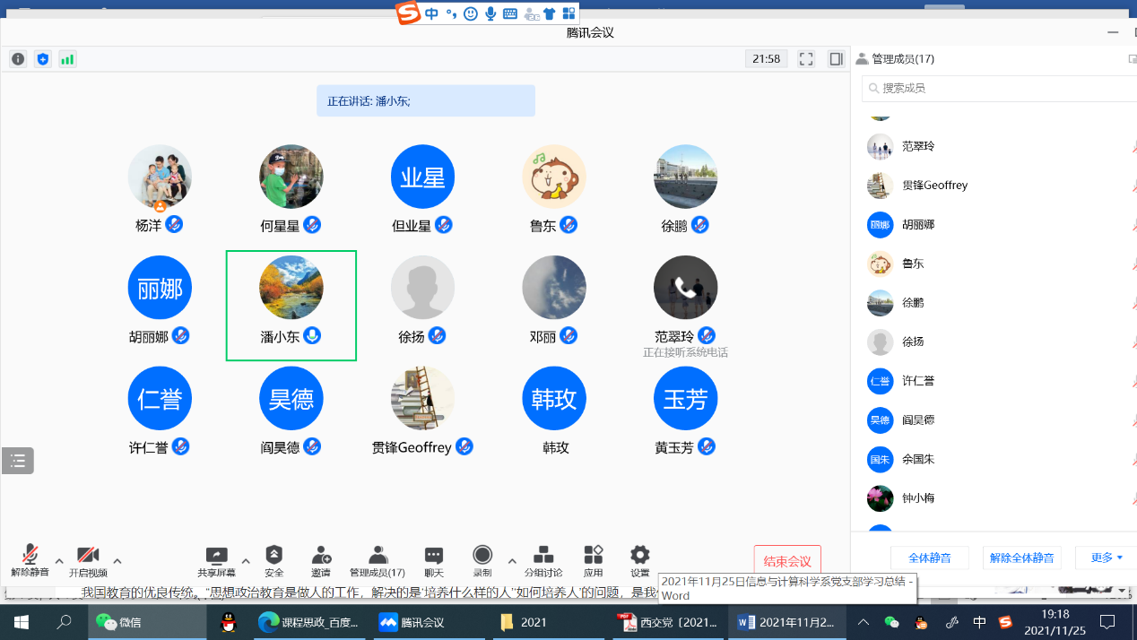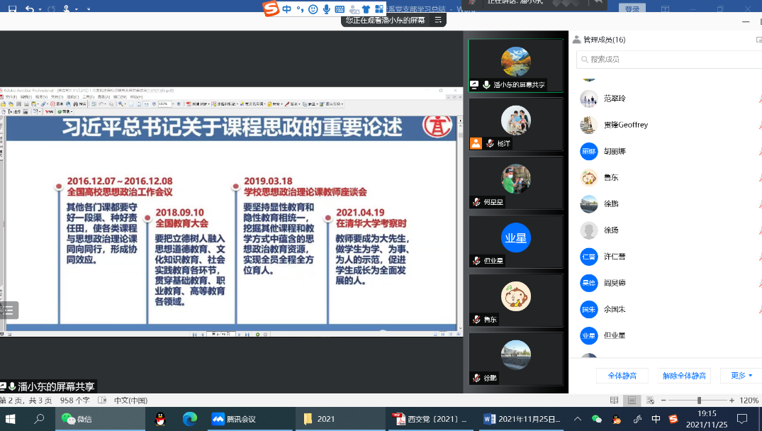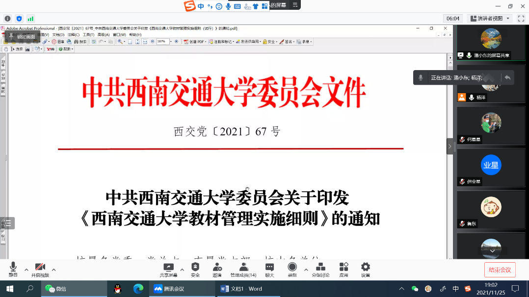 信息与计算科学系党支部通过腾讯会议(会议 ID:812-645-493)召开支部学习会议。潘小东副院长给老师们解读了[西交党[2021]67号_中共西南交通大学委员会《关于印发西南交通大学教材管理实施细则试行的通知》]、吴岩司长关于全面推进高校课程思政高质量建设的报告。