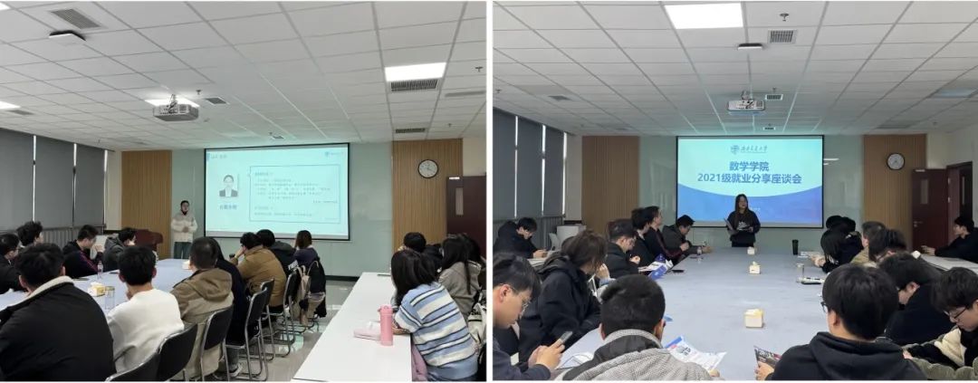 在交流分享会上,各代表首先以就业经验分享为主题进行发言,依次介绍他们在各行各业求职成功的秘诀。其中,许贤贤同学通过呈现个人简明的求职时间线,意在指导考研就业两手抓的同学们打开新思路,以精准筹备代替海投,同时积极利用空余时间为自身创造更多机会。李雪同学将她就业方向的确立与求职过程的坎坷向各位娓娓道来,这其中既包含屡次试错后的宝贵经验,又不乏亲身经历的坎坷之路,通俗易懂的讲解之下是实用性满满的求职经验。