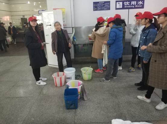 第二组打扫卫生的志愿者工作量比较大,但大家都很认真。有些同学带着手套,拿着抹布擦拭着候车大厅里的花盆,拿着钢丝球擦栏杆上的锈迹,努力地让大厅发出原来的色彩。一个下午的工作,每个人都全身心的投入到服务中,认真地打扫卫生。同学们一个个辛勤的背影折射出内心对志愿活动的无限热爱。