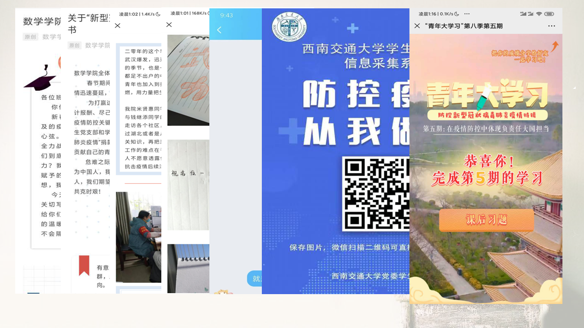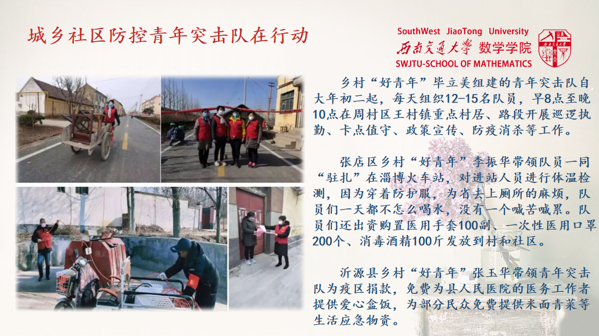 发起了针对“新型冠状病毒疫情”的捐款,号召我们献出爱心。数院团员同样积极参与抗疫志愿者活动,米贤惠就是其中一员。他们与社区工作人员一起走访各个社区,进行登记人员信息等工作,为打赢疫情阻击战贡献自己的青春力量。
