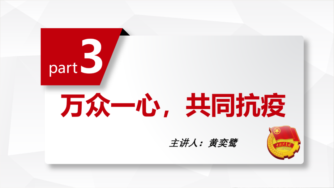 本次团课紧跟时事,集中精力开展了对支部成员在疫情期间的思想教育和意识强化。每位团员都会紧密团结在以习近平同志为核心的党中央周围,集中力量共克时艰,不信谣不传谣,充分发挥共青团生力军和突击队的作用。希望支部团员们能尽己所能,坚决打好此次疫情防控阻击战,为社会正常秩序的恢复贡献自己的青春力量!