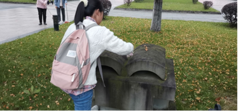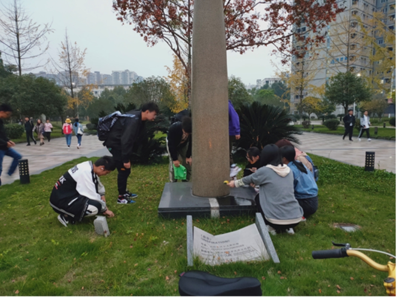 分组一的同学擦拭了石碑“启示”并清理了石碑旁的垃圾。