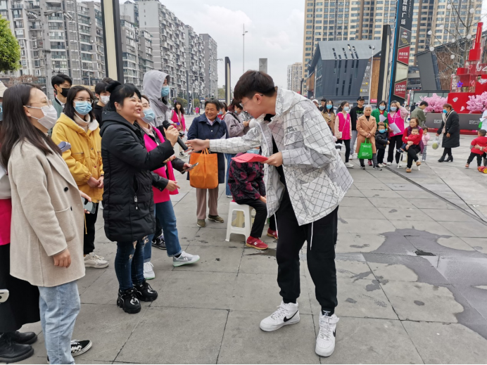 上午8时30分,天空飘着小雨,空气透着一丝微凉,活动参与成员到达犀浦润扬双铁广场,进行活动准备,并分发社区防诈骗和妇女节相关宣传单。
