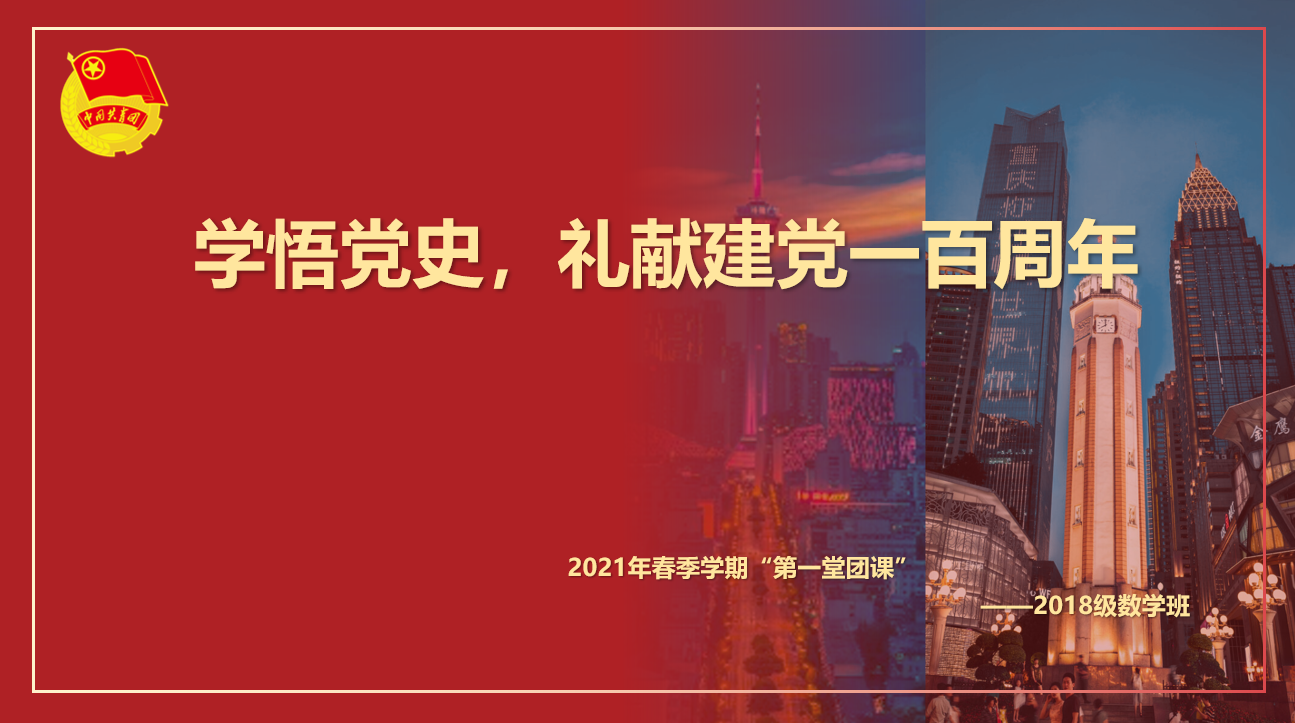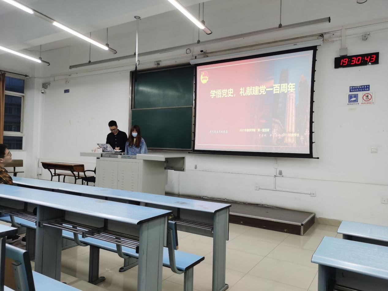 应用数学2018级1班团支部于4月9日19:30在X2416开展了“开学第一堂团课”。此次团课以“学悟党史,献礼建党一百周年”为主题,由数学一班团支部书记梁浩同学和数学二班团支部书记邱灵同学共同主持开展。团支部特别邀请“团干部联系青年1+100制度”的联系人林玉、邱灵参加团课。