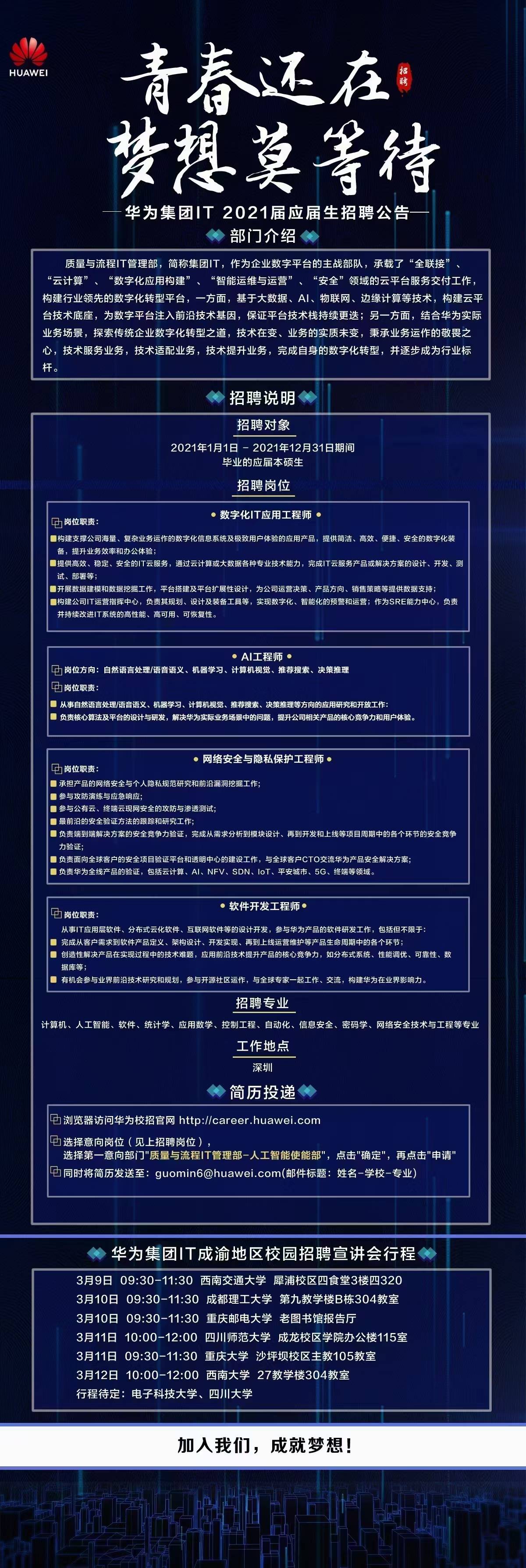 华为集团IT应届毕业生澳门六合彩开奖结果 专场招聘会,时间:2021年3月9日晚上7:00,地点:四食堂三楼317会议室