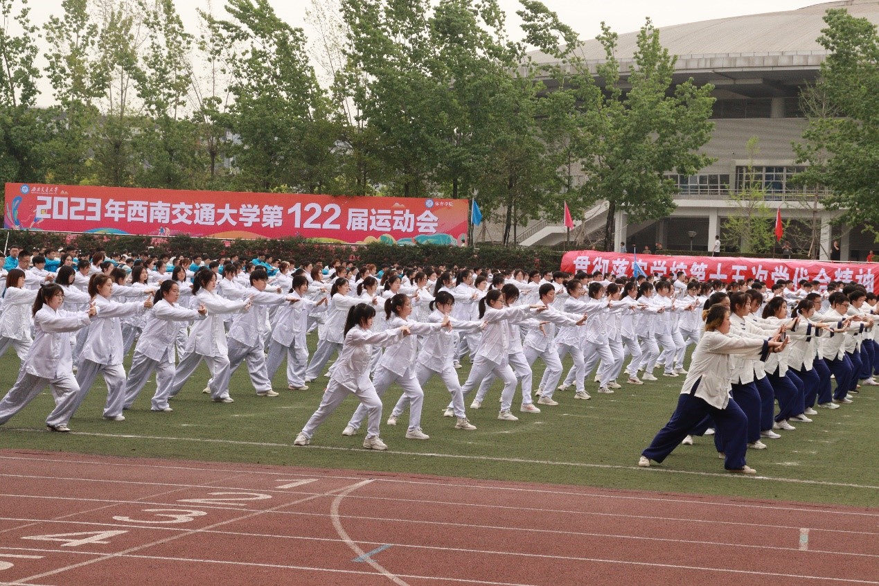 随后,运动员代表、裁判员代表庄严宣誓。王顺洪宣布,西南交通大学第122届运动会暨2023年“健康月”活动正式开幕。开幕式表演以极具中国特色的武术、舞狮、太极拳为主,充分展现了交大学子积极昂扬的精神风貌。