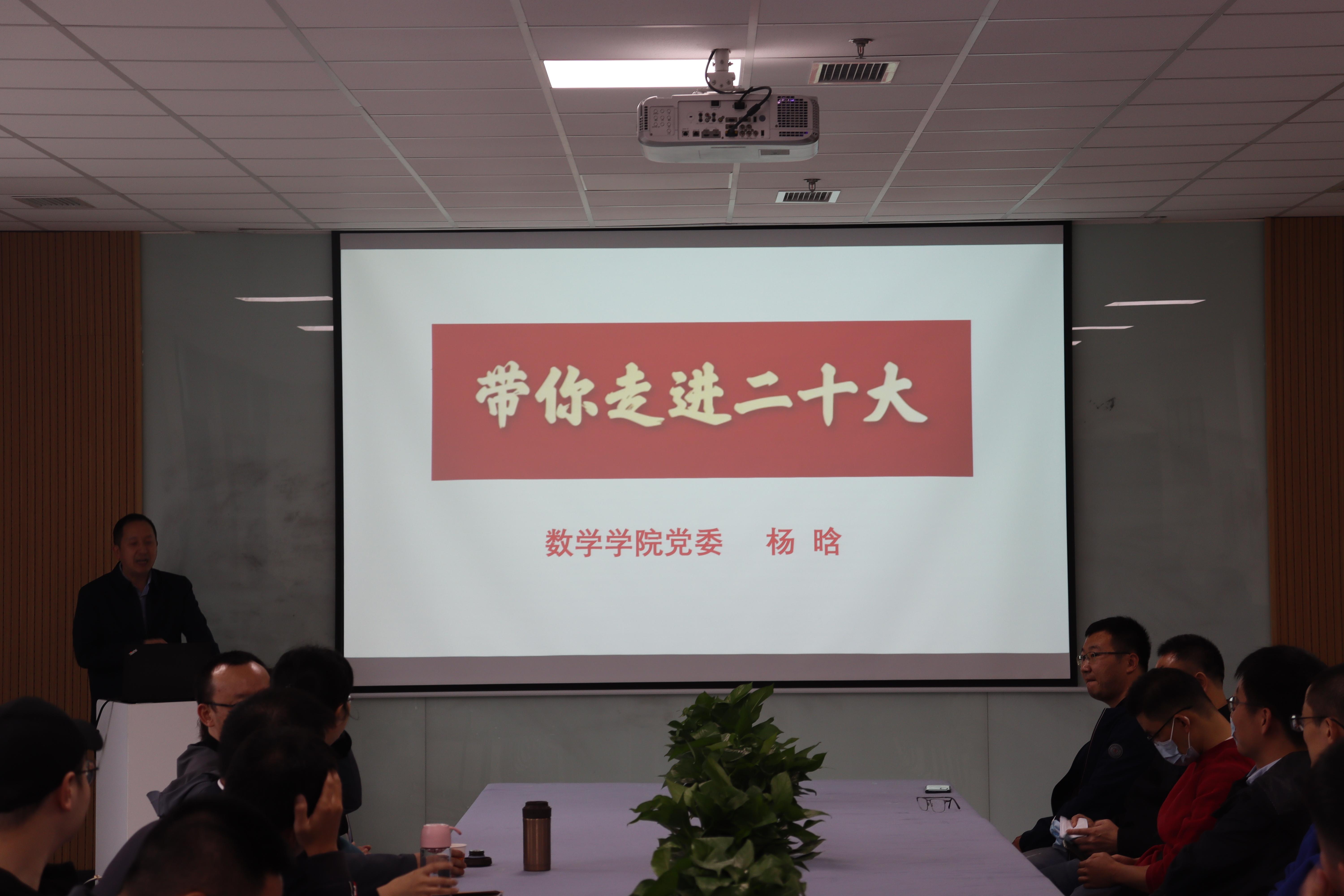 活动伊始,杨晗院长以刚刚召开的二十大为切入点,以数学人的角度来解读二十大的报告内容。在这次讲话中,杨晗院长提到了大会主题、三个务必、三件大事、中心任务等内容,这些均与党的二十大报告所提出的中国式现代化息息相关。杨晗院长用生动的口吻为在座的各位老师讲述了在二十大报告中出现的关于中国式现代化的“五个特色”、中国式现代化的本质要求和如何实现中国式现代化这一战略性目标的内容。除此之外杨院长重点谈到了二十大报告中对教育工作的重视,并以此为切入点,着重强调了高校教师应该将教书育人作为工作中的主要职责。同时,杨院长特别谈到了教育研究部门对基础研究工作的大力支持,他叮嘱各位青年教师作为澳门六合彩开奖结果