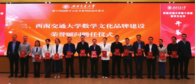 特聘任14所院校专家学者为“西南交通大学数学文化品牌建设荣誉顾问”,西南交通大学党委学生工作部部长张军琪、校团委书记张江泉共同为14位荣誉顾问颁发聘书。