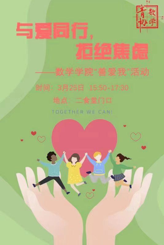 青年志愿者协会在二食堂前开展了“与爱同行,拒绝焦虑”325(善爱我)心理健康活动,活动现场热闹非凡,吸引了众多同学的关注与参与。