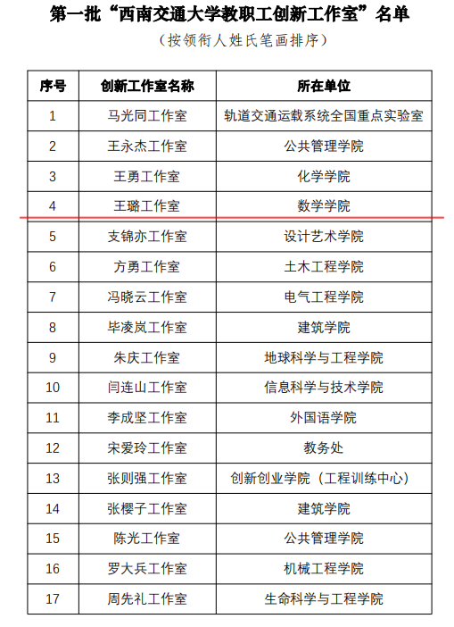 “西南交通大学教职工创新工作室”旨在大力弘扬劳模精神、劳动精神、工匠精神和科学家精神,发挥劳模和技能人才的示范引领和骨干带头作用,激发广大教职工劳动热情、创新创造活力和岗位建功,经学校第二十一届工会委员会第15次常委会研究,决定命名马光同工作室等27个教职工工作室为第一批“西南交通大学教职工创新工作室”,我院王璐教授所率领的数学建模教学创新工作室顺利进入首批名单。