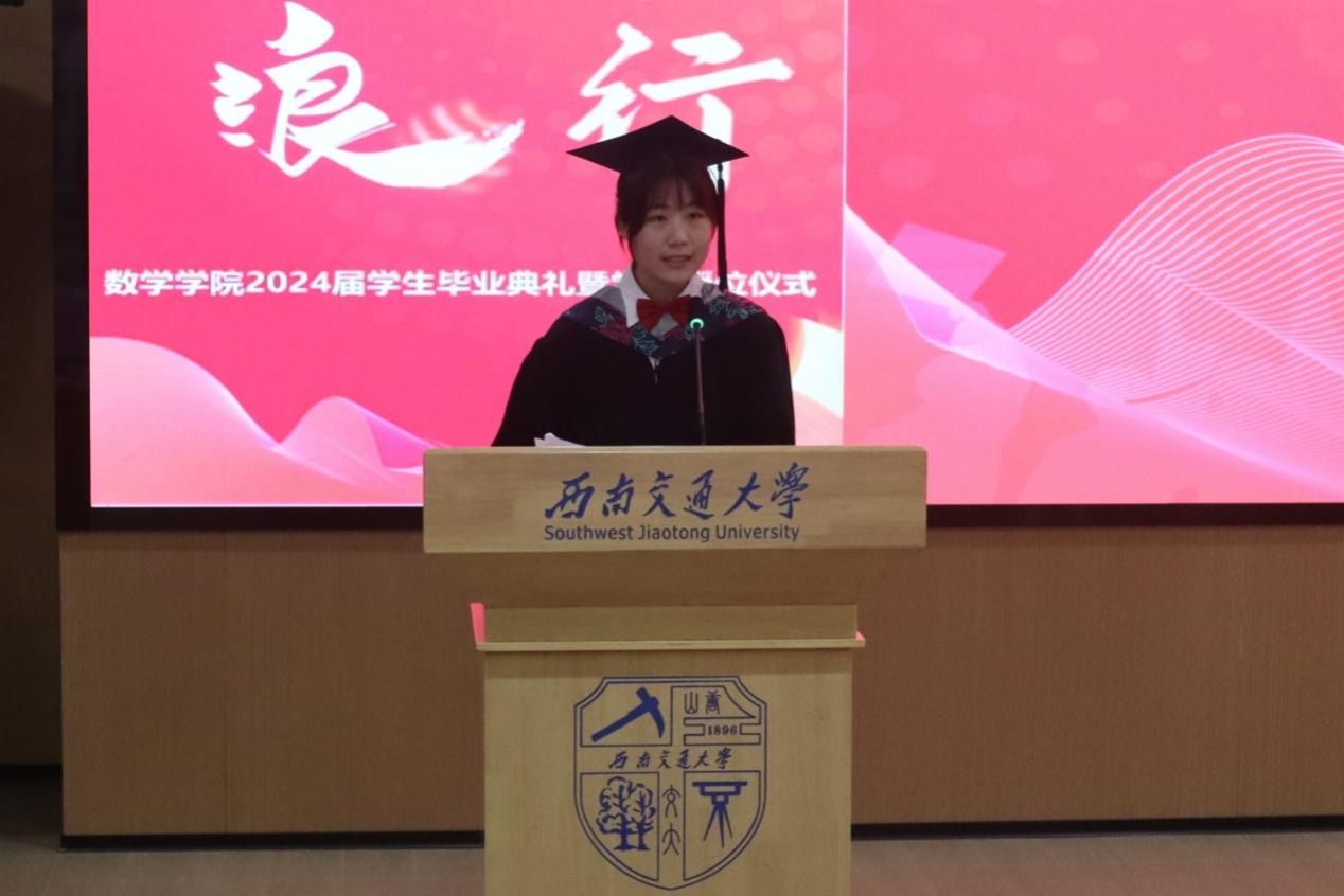典礼第一项,院长杨晗教授致辞。杨晗院先向2024届全体毕业生致以热烈的祝贺,对教职工、家长亲友的辛勤付出表示诚挚的感谢。离别之际,杨晗院长对毕业生寄予四点厚望,一为:做一个对得起国家、社会和自己的人。要志存高远、勤奋笃行、不断进取、追求卓越,成为“为学、为事、为人”的典范。二为:做一个热爱学习、保持奔跑的人。信息时代是数学人大有作为的时代,要始终保持一种学习的状态,锻炼改造自我、改造社会的能力,自信从容地面对未来的挑战。三为:做一个独立思考、温暖纯良的人。保持独立思考的能力,经历人生的磨砺后依旧怀抱善良和热爱,与世界共同成长。四为:做一个赶路并欣赏风景的人。尽管未来充满未知与挑战,也要保持平常心,享受旅途的每一个瞬间。最后,杨晗院长再次祝愿2024届毕业生们“所见皆美好,所行皆坦途,所爱皆可得,所想皆如愿”。