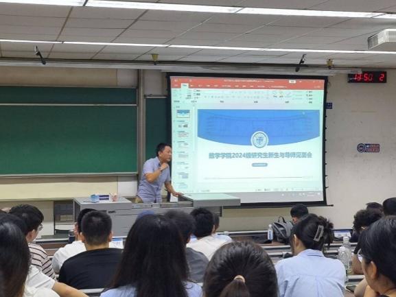 院长杨晗、院长助理杨洋、数学系主任刘品、信息与计算科学系主任孟华、统计学系主任唐家银及研究生辅导员盖少通,与2024级全体硕士研究生和博士研究生共同参与,会议由辅导员盖少通主持。