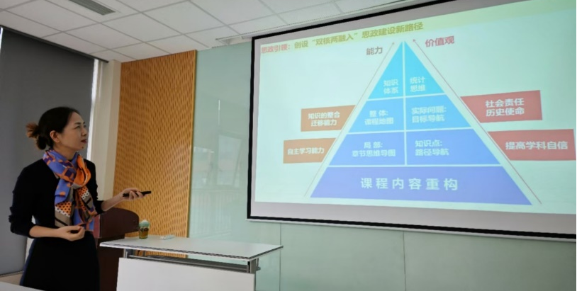 除了课程本身,刘赪副教授还注重分享了概率论课程与其他数学类公共基础课程的结合,并以高等数学课程为例,进行关联知识点的详细介绍。同时还介绍了高等数学、线性代数、概率论与数理统计、数学建模等课程的课程群建设思考。