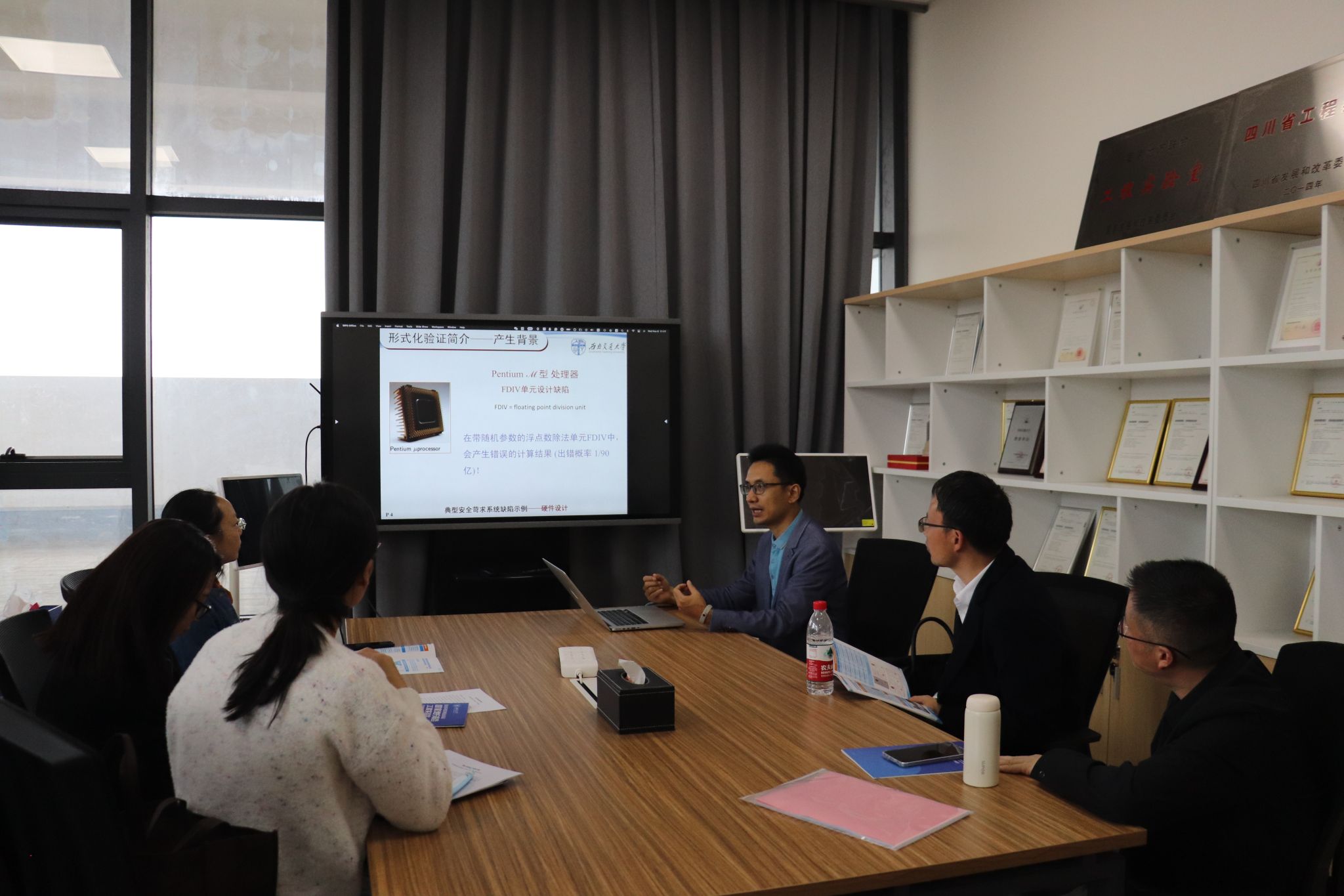 随后,阿坝师院师生一行到3号教学楼6楼参观系统可信性自动验证国家地方联合工程实验室。实验室王恪明副教授为大家讲解了基于推理的验证原理及其在各个系统中的应用,同时带领同学们到实验室机房体验从实际抽象出来的标准求解算例在机器上面是如何用实验室所开发的系统求解的。随后王恪铭副教授在会议室以《自动推理验证理论及其在安全苛求行业中的应用》为主题,就形式化验证的简介、应用、研究基础等向阿坝师院的师生进行讲解。