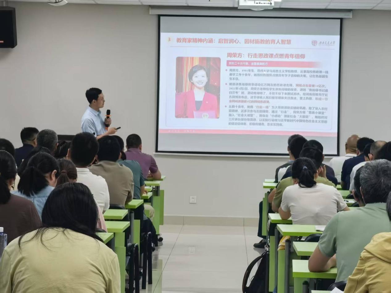 党委副书记、纪委书记郑波作题为“大力弘扬教育家精神、争做新时代大先生”的专题报告。郑波从追求师德“高线”,自觉践行教育家精神;守住师德“标线”,以十项准则规范行为;远离师德“红线”,以案为鉴,警钟长鸣三个方面,就教育家精神的内涵、新时代高校教师职业行为十项准则、师德师风警示教育进行了深入解读。