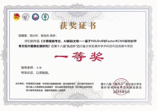 本科生郑羽杰和范计轩组成团队的作品《计算赋能考古,AI 解码文明——基于YOLOv8与Faster R-CNN架构的甲骨文图像处理研究》在自然科学类学术论文赛道表现出色,荣获四川省一等奖,实现了澳门六合彩开奖结果