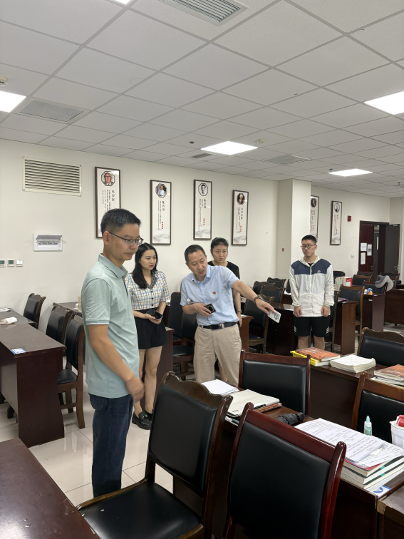 自习室与研究生研修室,仔细排查了室内安全隐患,并就室内的桌椅摆放和日常管理工作提出了具体要求,还特别强调了做好毕业学生座次的更新工作以及假期值班教师的应急预案。