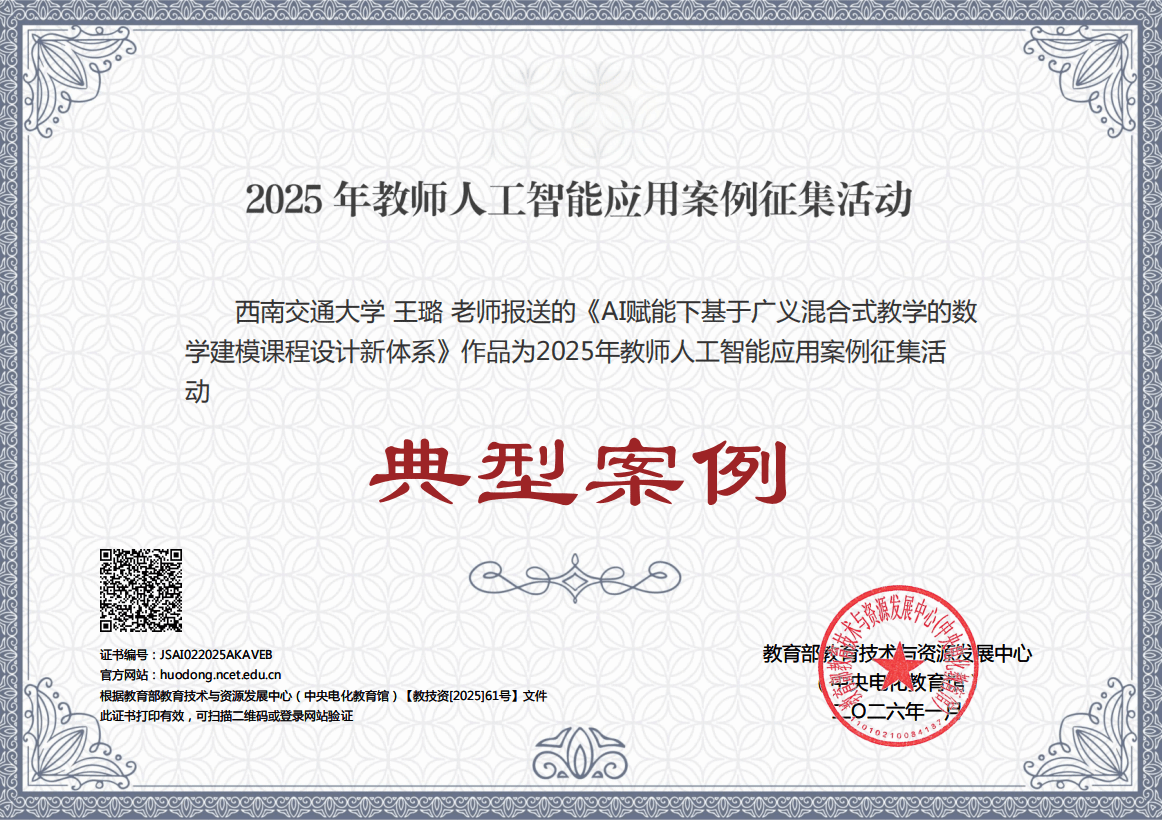 高度重视并积极组织申报筹备工作。经学校遴选、四川省推荐,由王璐教授牵头的数学建模教学团队推荐案例脱颖而出,获评国家级典型案例。该案例构建了融入AI的数学建模混合教学新体系,以真实教学问题为导向,创新运用人工智能和大数据等技术,在教学设计、教学内容、教学过程与教学评估等方面形成了融入AI的解决方案,为破解传统教学难题、提升课程教学质量和学生学习成效提供了有益范式。