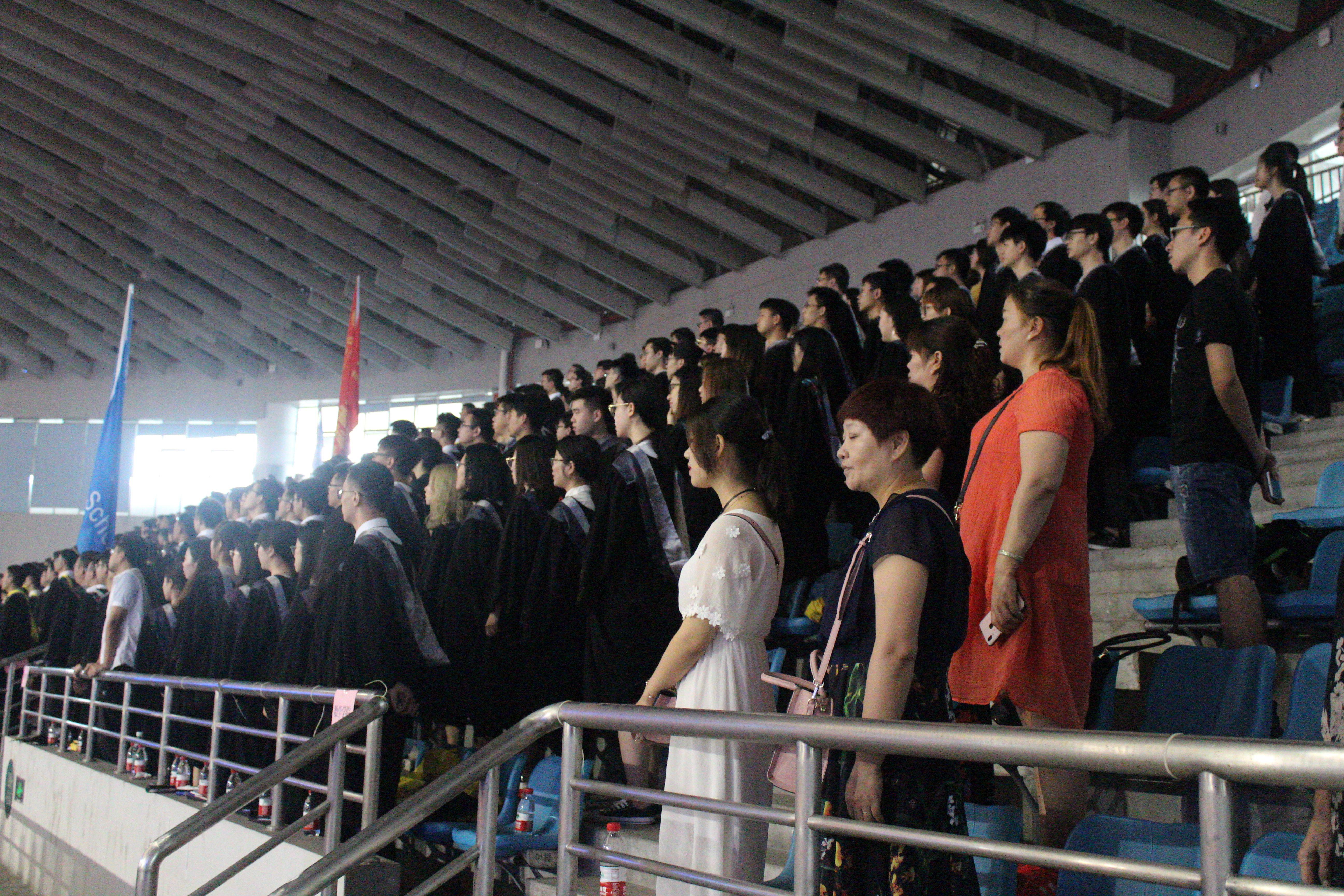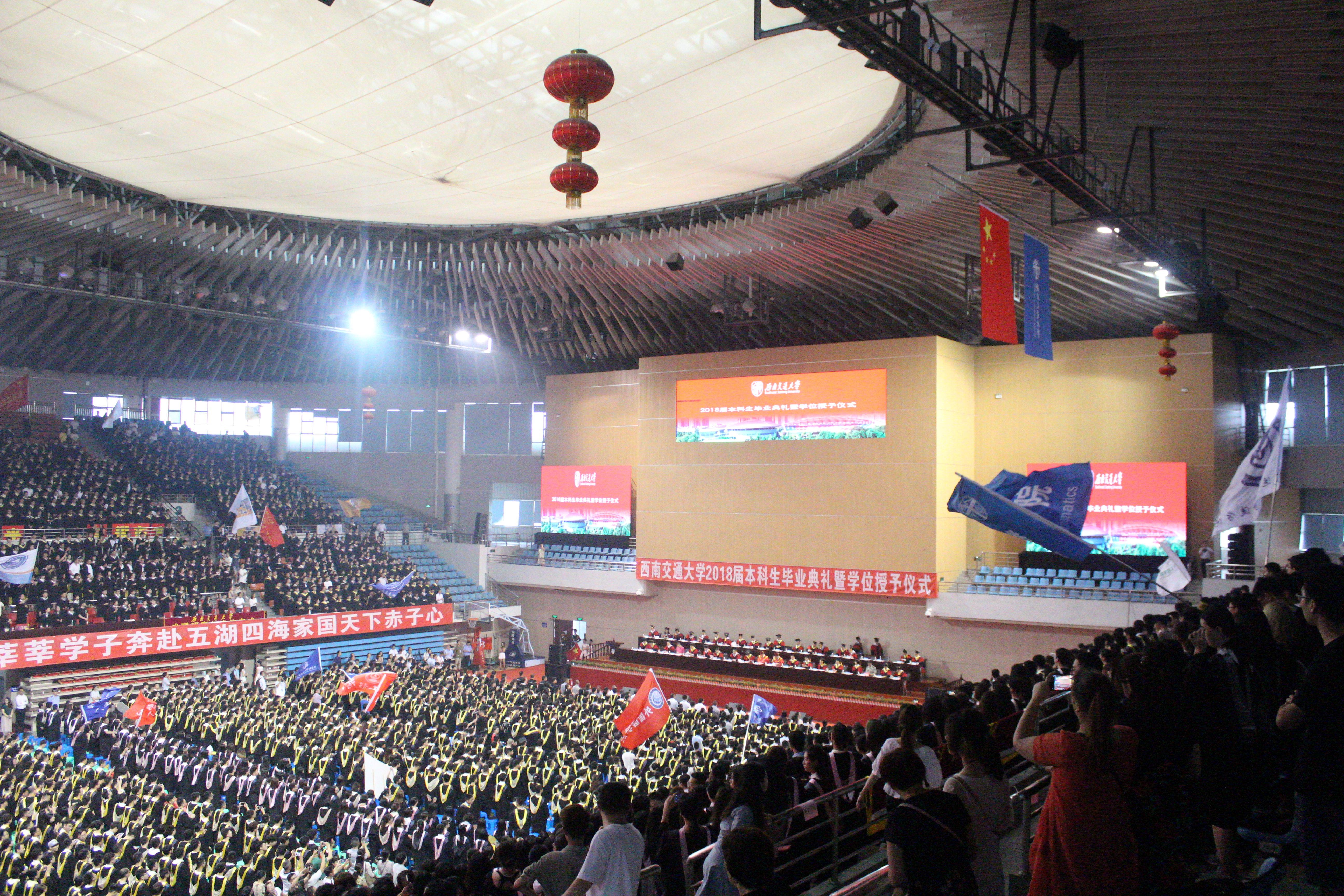 10点30分左右,毕业典礼已经步入尾声,体育馆内响起了西南交通大学校歌,当听到熟悉的旋律时,全体起立,每个人都全情投入地唱了起来。大家在这片自己深爱的土地上生活了四年,而现在却要分别,大家都不舍离去。