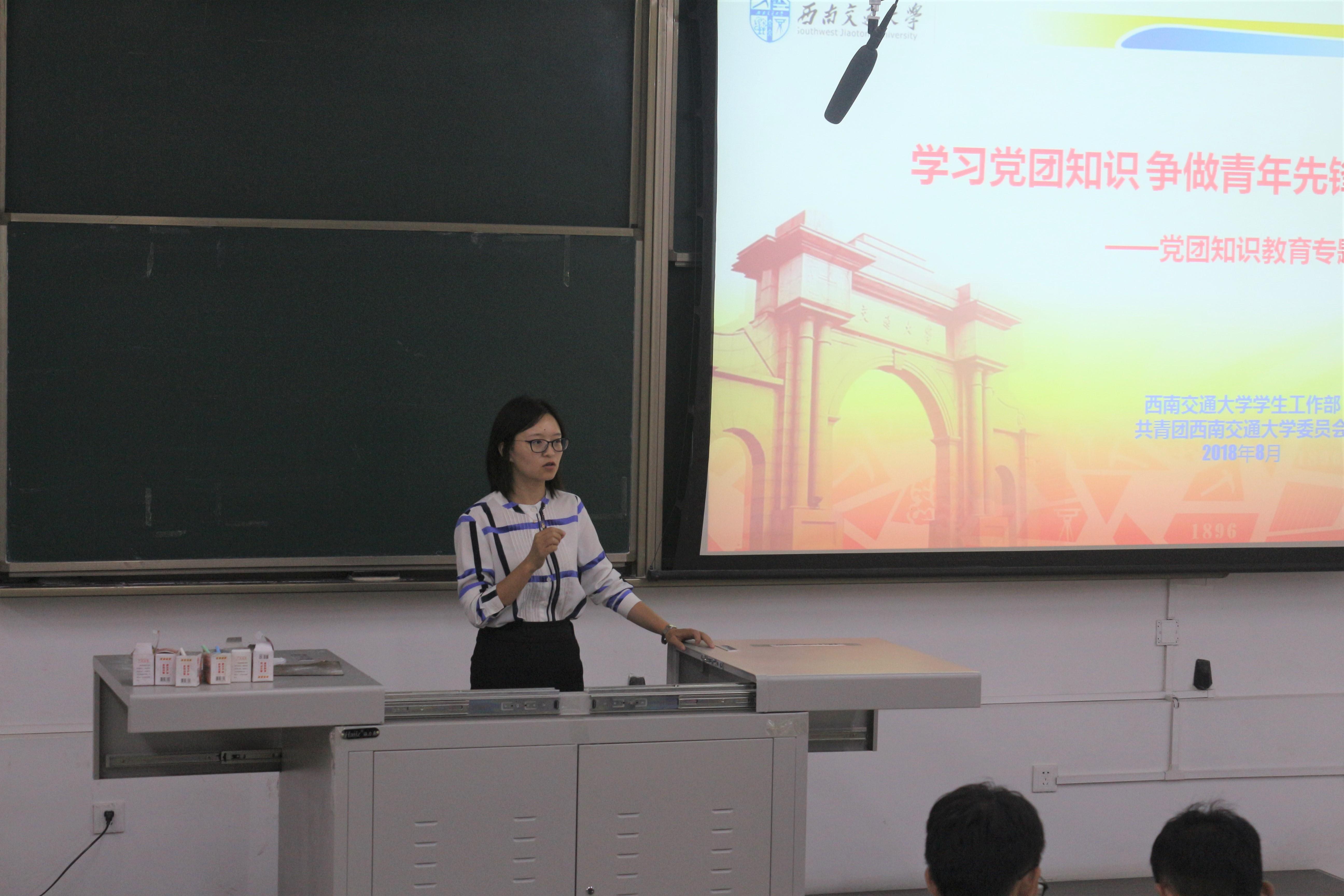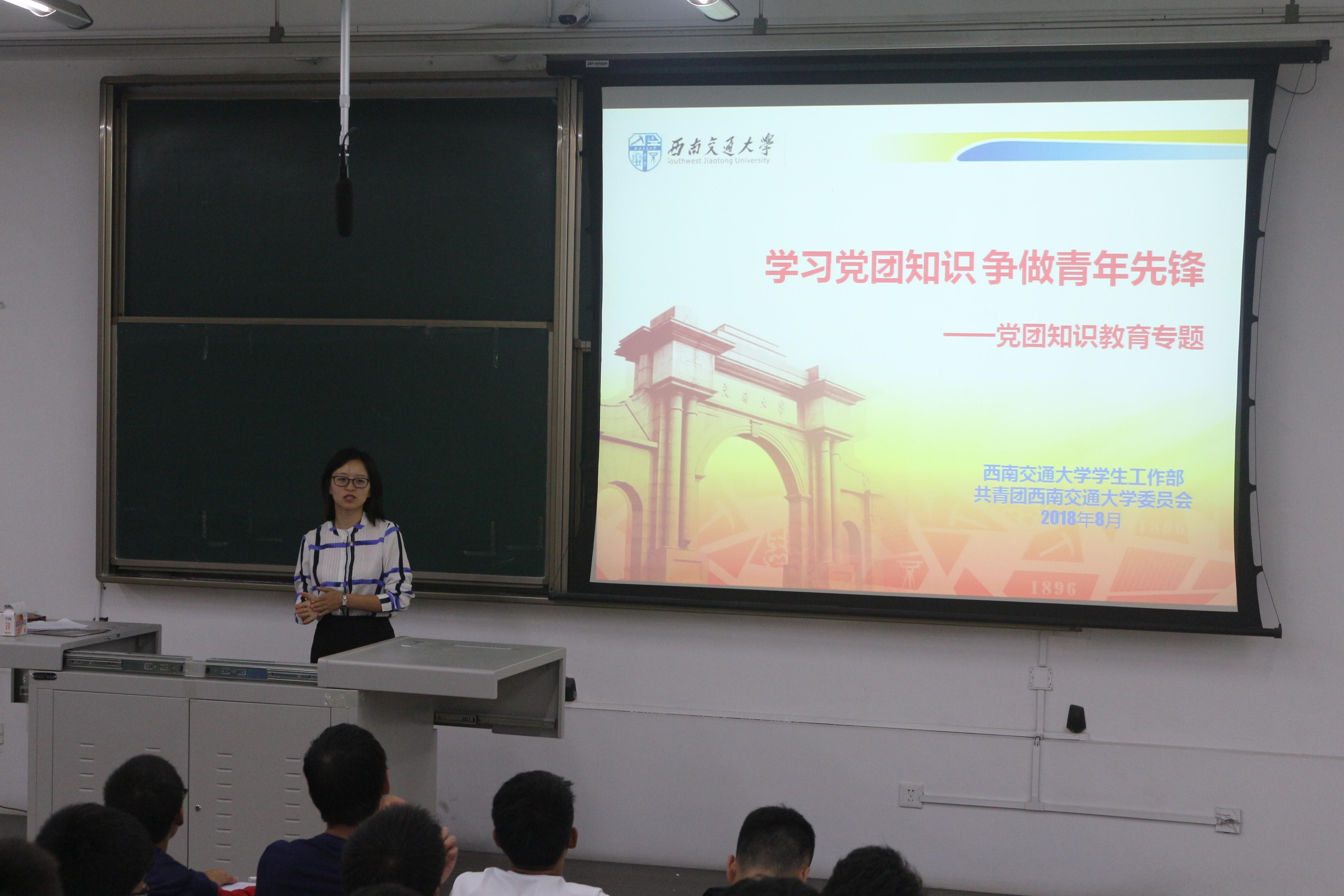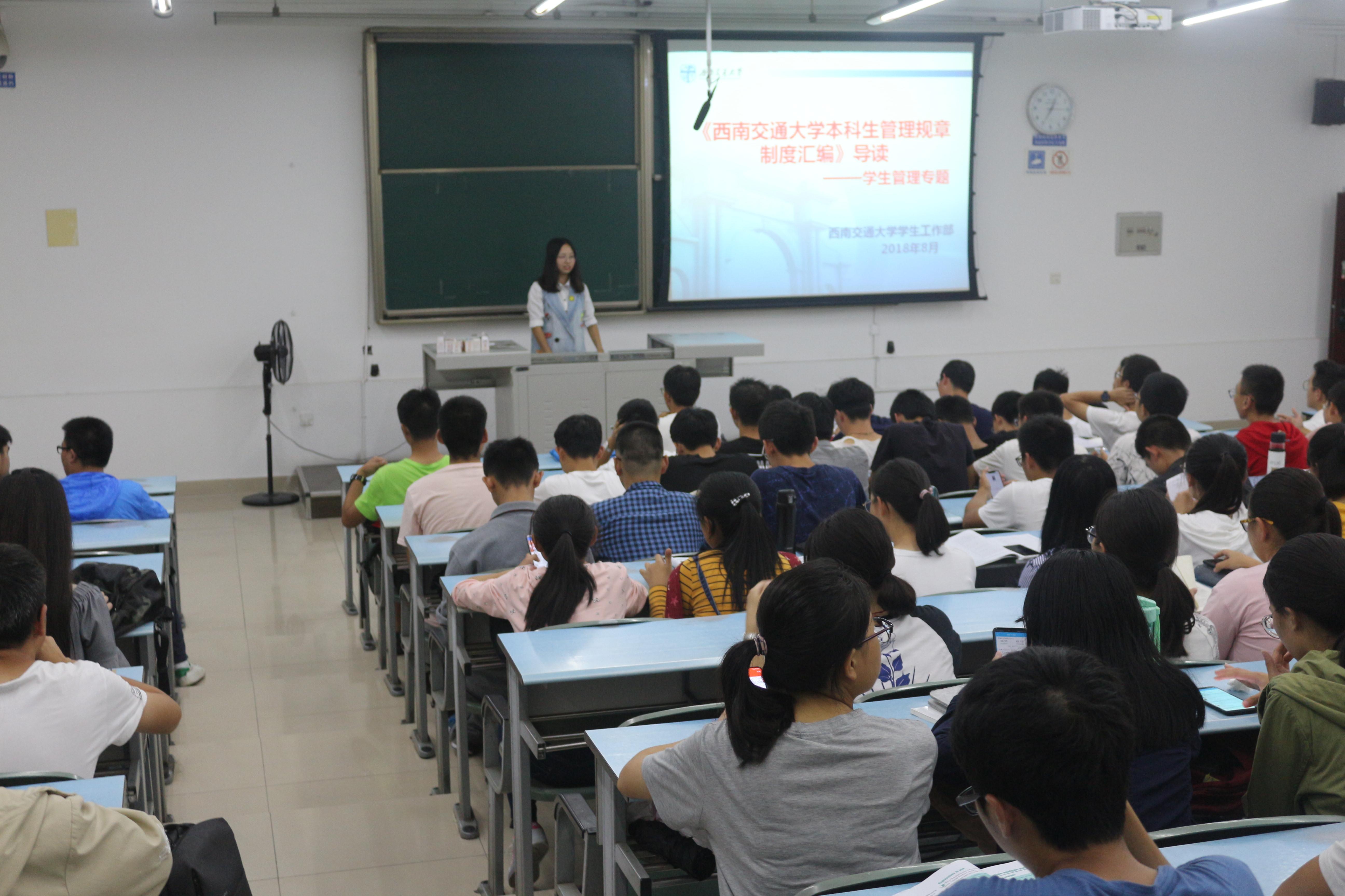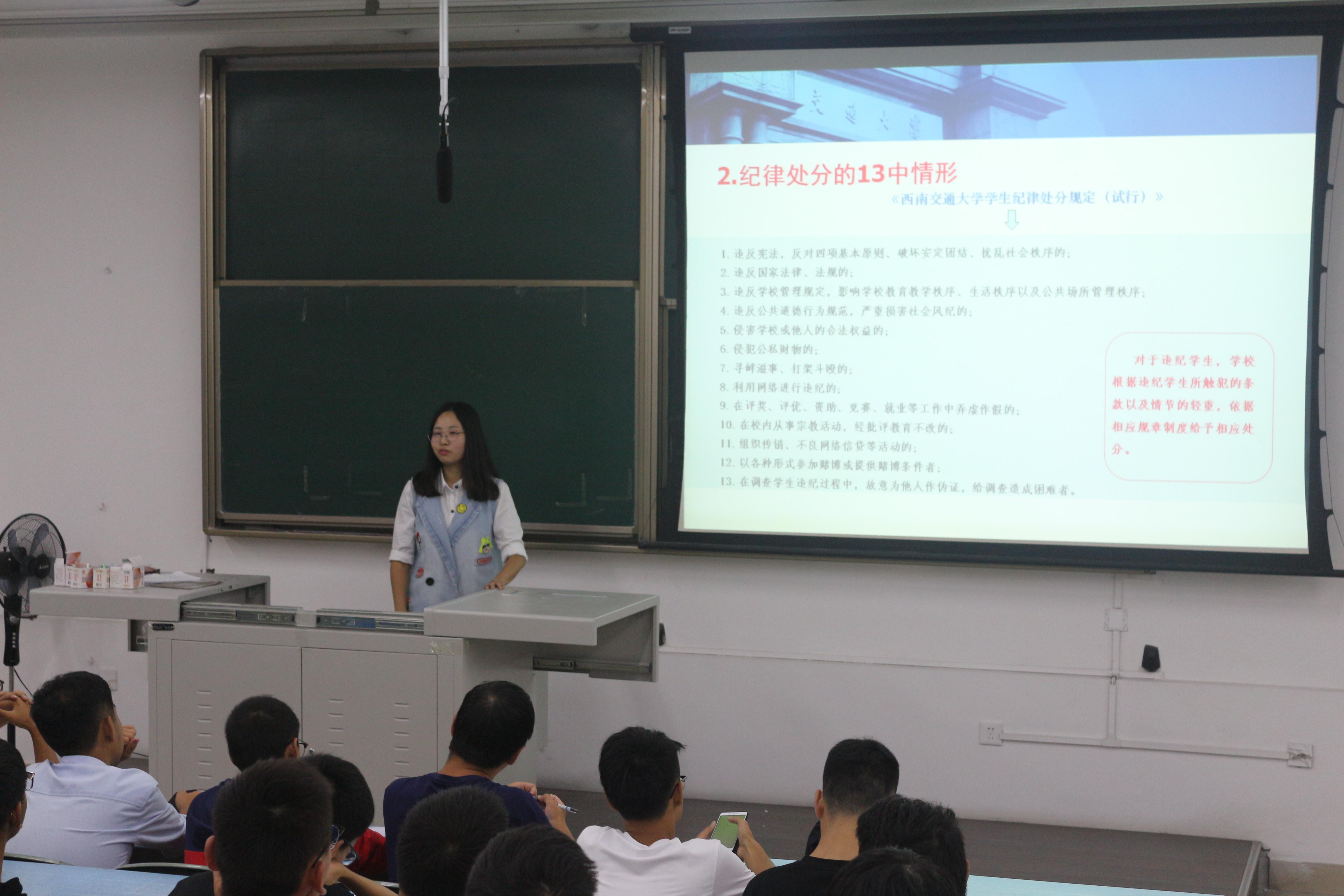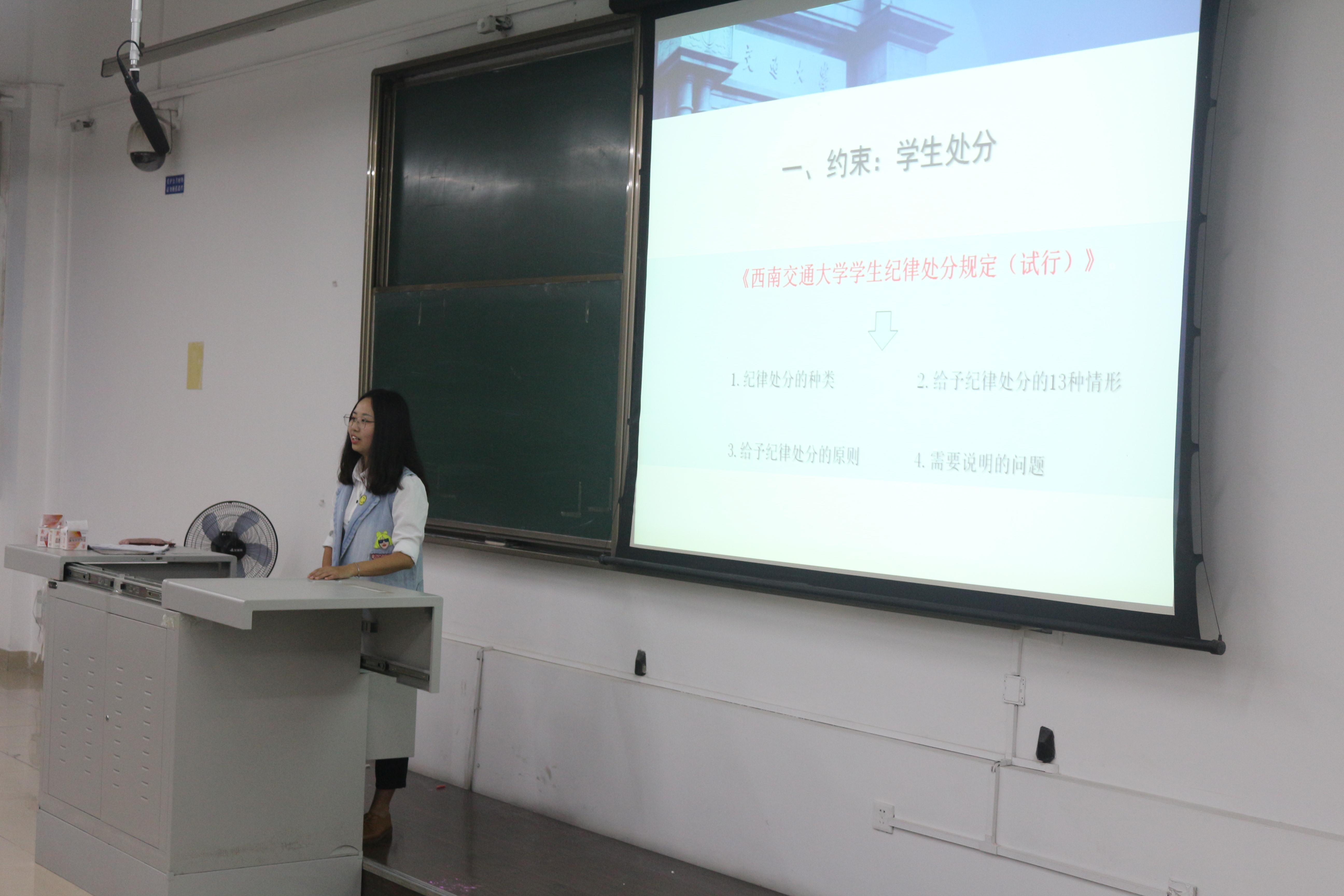 7点整,钟义婷老师首先为大家讲解了《西南交通大学本科生管理规章制度汇编》的大体内容。钟老师首先介绍了规章制度的大体分类,帮助同学们更清晰地理解学校的管理制度。随后,钟老师从13种处分情况入手,为新生们讲解学校处分的规矩,并告诫大家守规矩、讲诚信。接着,老师讲解了一些关于荣誉称号的问题,旨在让大家正确认识奖学金与助学金,并鼓励大家努力去争取荣誉。