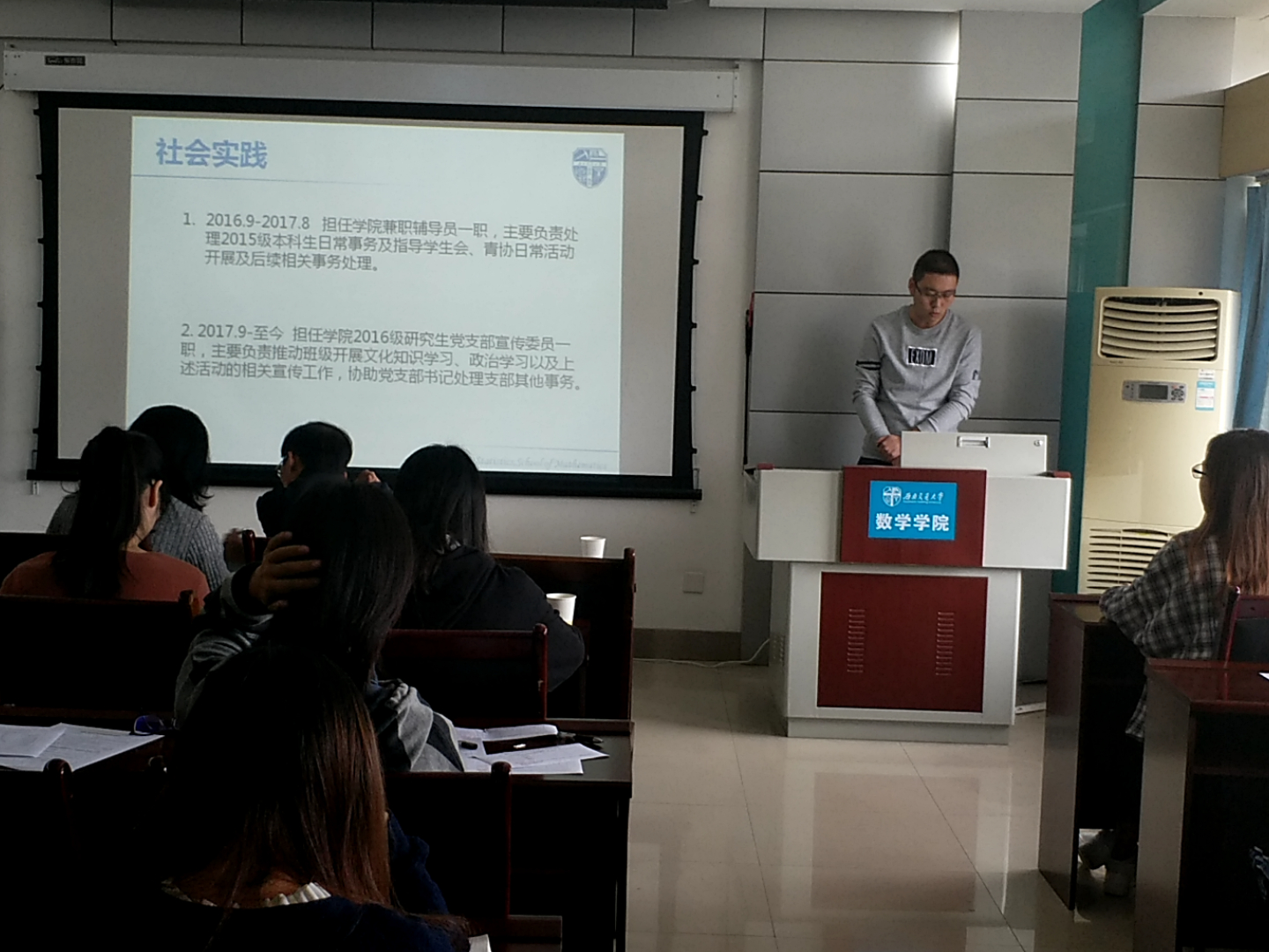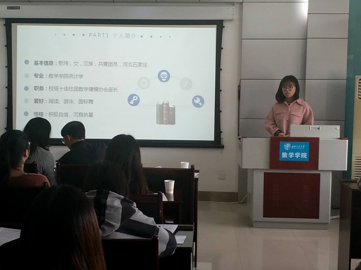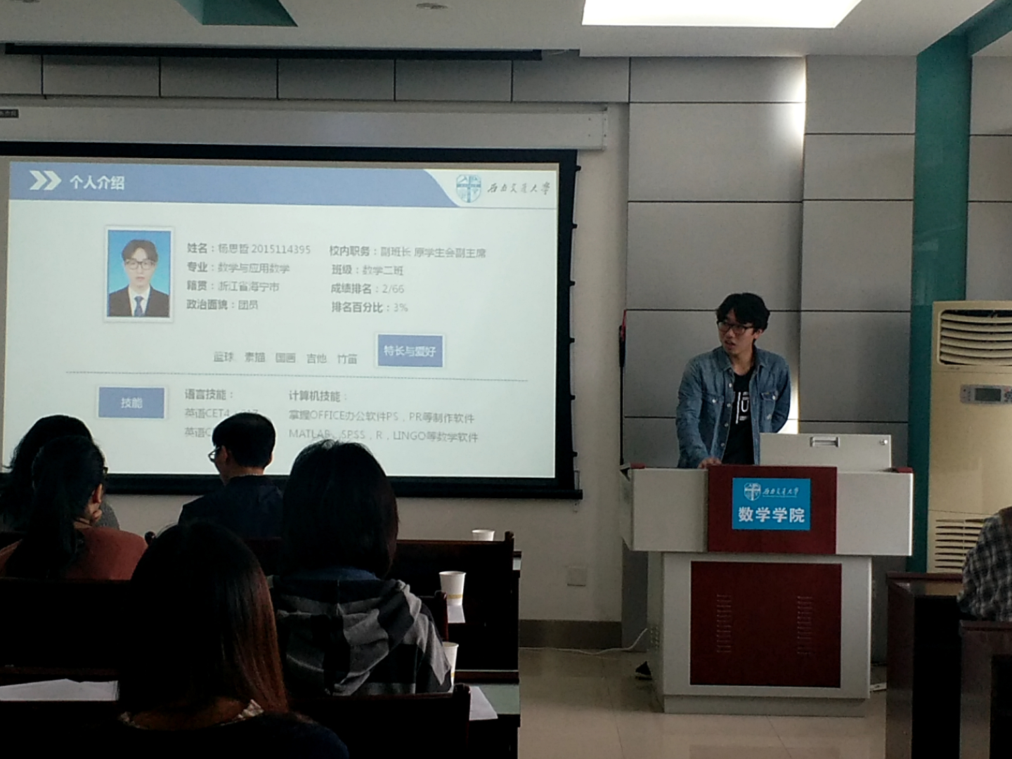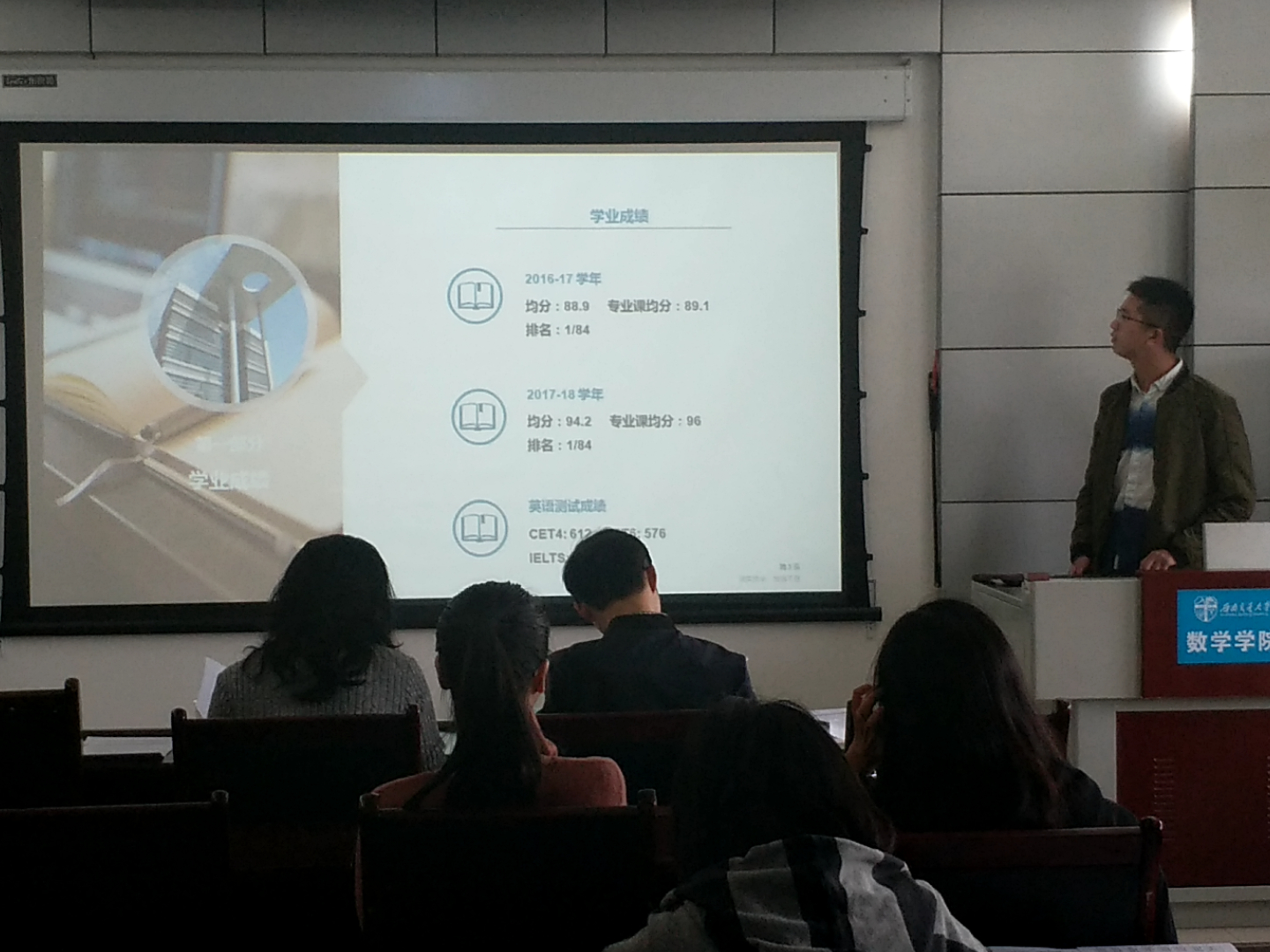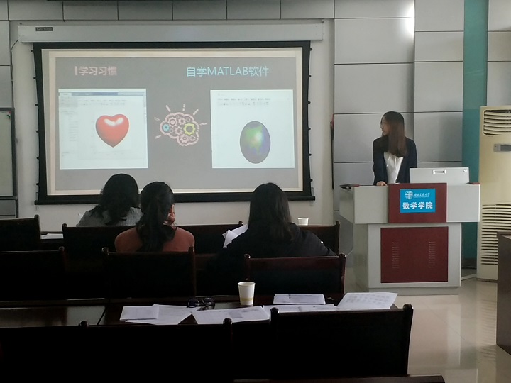 接下来轮到研究生做出答辩。这一环节,首先是研究生标兵答辩,由答辩人王慧霞、高琪、曹宇宇三人展示研究生的个人风采。他们从科学竞赛、社会实践、学习成绩等若干个方向阐述自己身为研究生的杰出方面,展现出他们的个人精神风貌以及优秀的个人综合能力