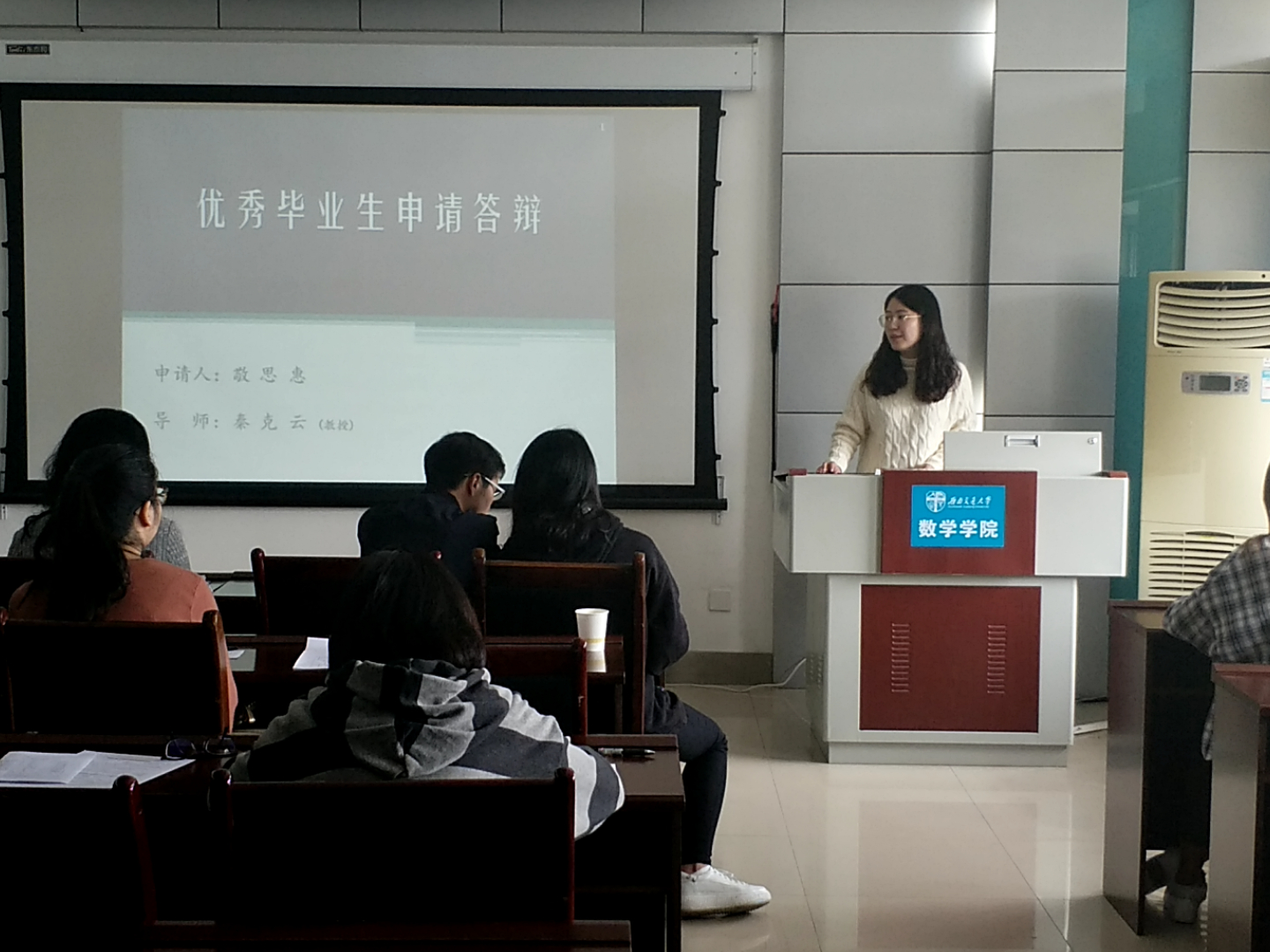 。继而,研究生优秀毕业生答辩作为最后一项,由五位答辩人田海涛、苏阳、张雯琴、高琪、敬思惠向大家展现身为研究生所参与的科学竞赛、所经历的社会实践、所获得荣誉奖章以及所拥有的良好特质。他们分别阐述了自身的感悟,又深层次地表达了对未来发展的展望。