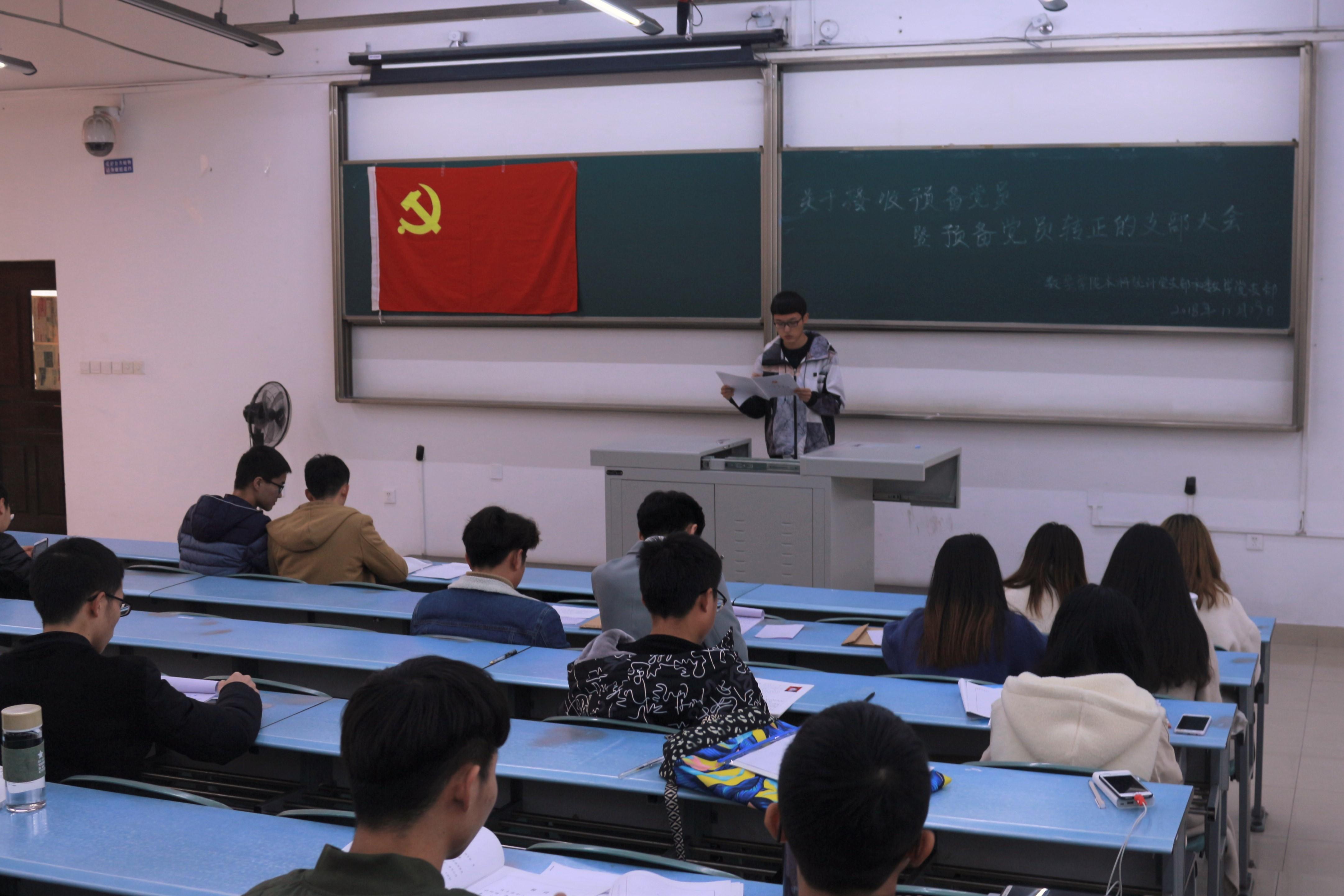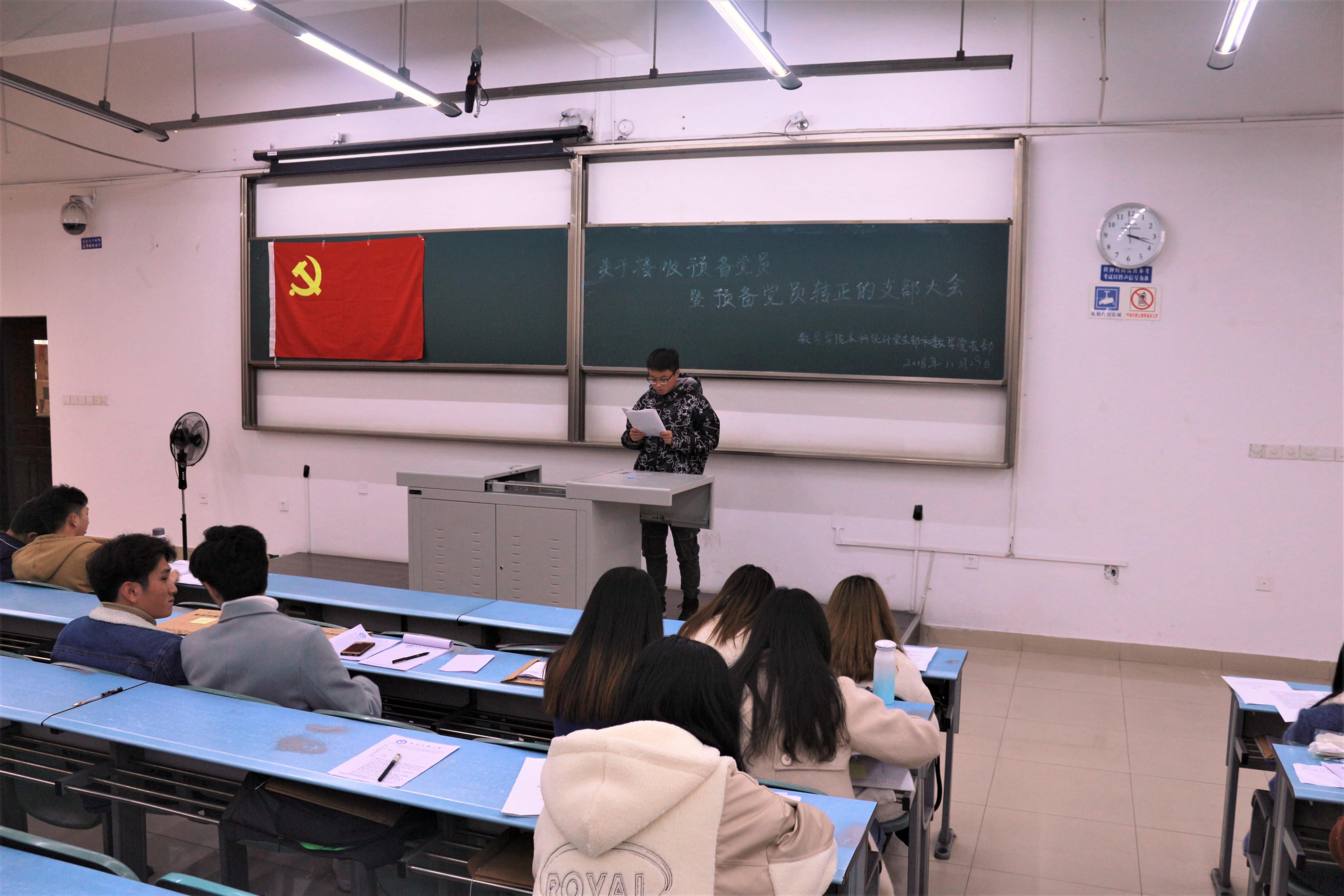 发展对象们依次上台宣读了自己的入党申请书,以坚决、诚恳的态度表明了他们加入中国共产党的决心和意愿。由入党介绍人介绍他们的基本情况后,与会正式党员无记名的投票表决是否同意他们成为中共预备党员,最后由党支部书记宣读支部大会决议:同意接收陈潭升、周小兰等十名同志成为中共预备党员。