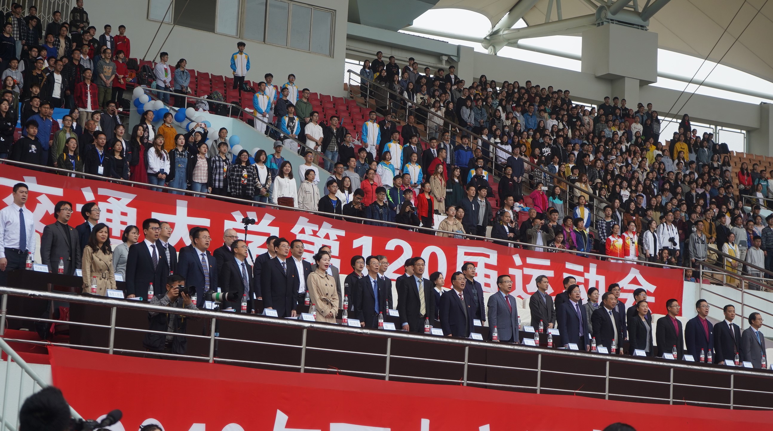出席开幕式。随后,全体起立奏唱中华人民共和国国歌,庄严歌声环绕着交大校园。接着,西南交通大学校长徐飞致开幕词,赞扬了过去一年,表达了对于运动健儿们的加油与祝福。随后,运动员代表和裁判员代表宣誓。西南交通大学党委书记王顺洪宣布“西南交通大学第120届运动会” 正式开幕。运动员退场,开幕式表演正式开始。