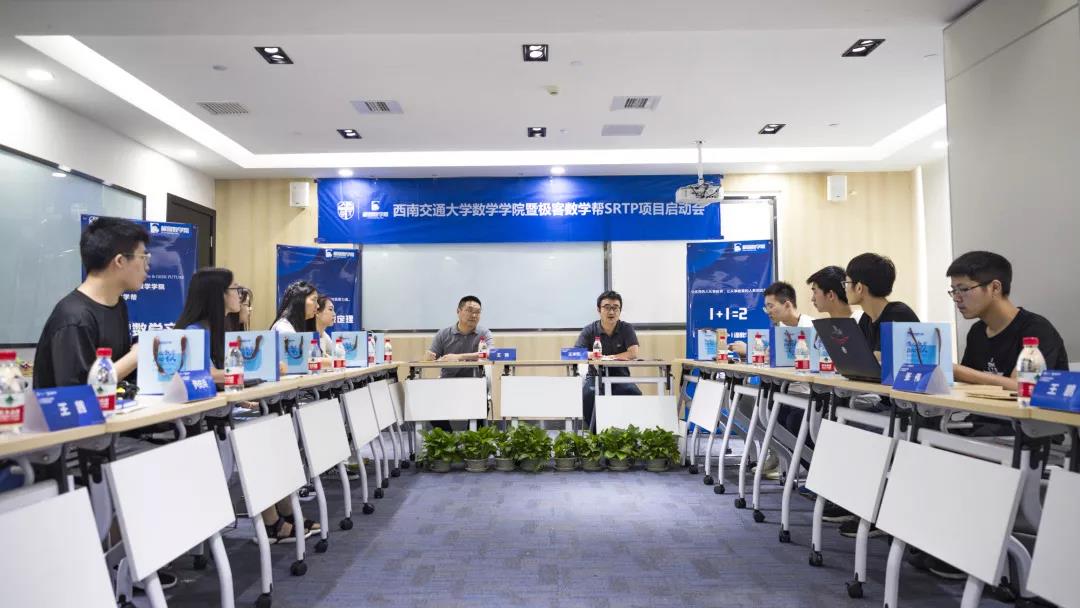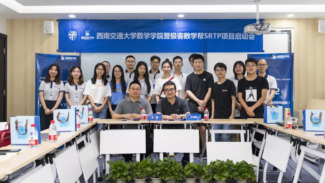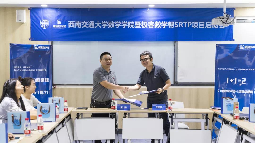 副院长王璐、极客数学帮成都大区校长王李阳、教学研发中心总监叶茂,签订了SRTP项目合作协议。西南交大科研项目组将和极客教研团队共同研发数学教研产品。