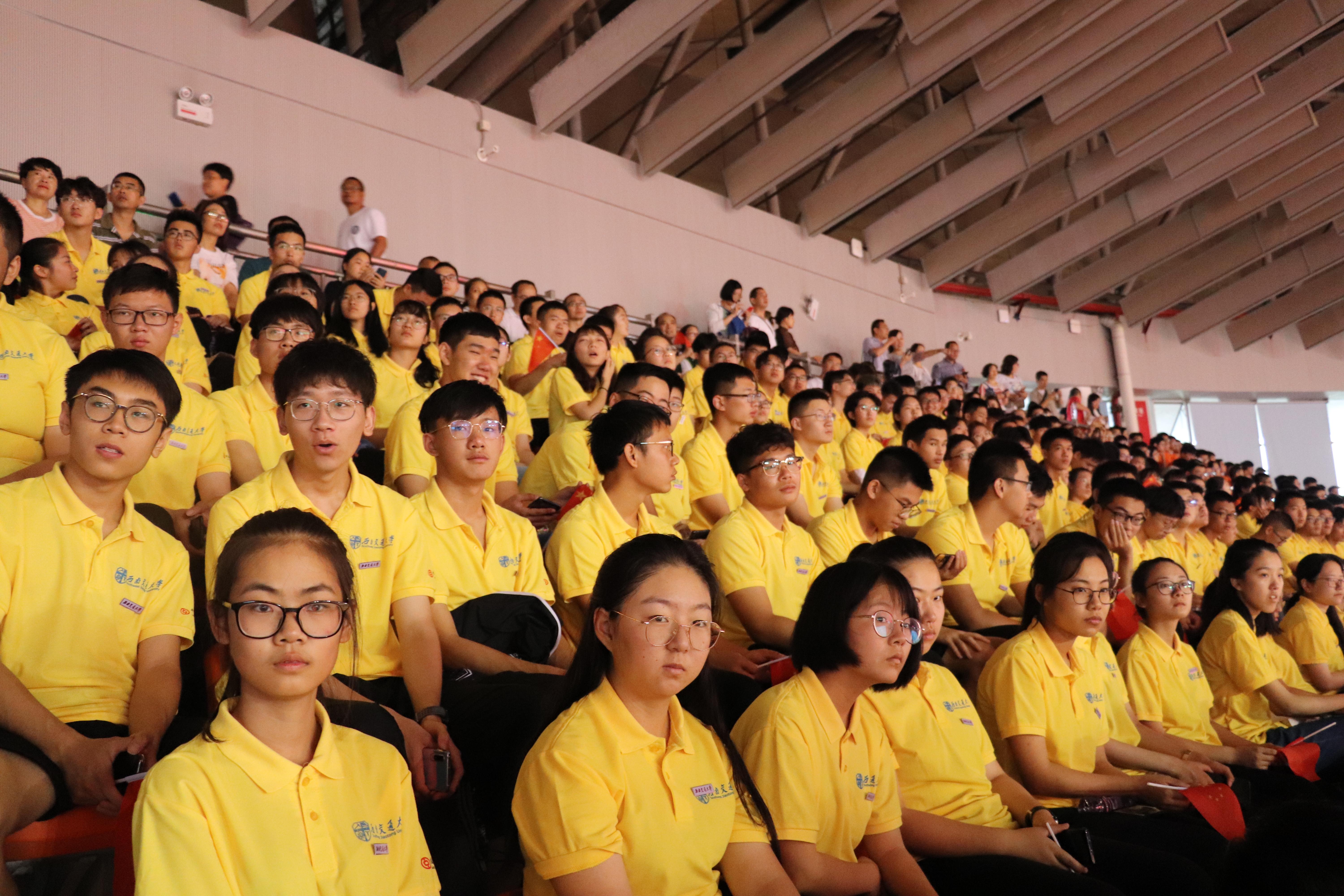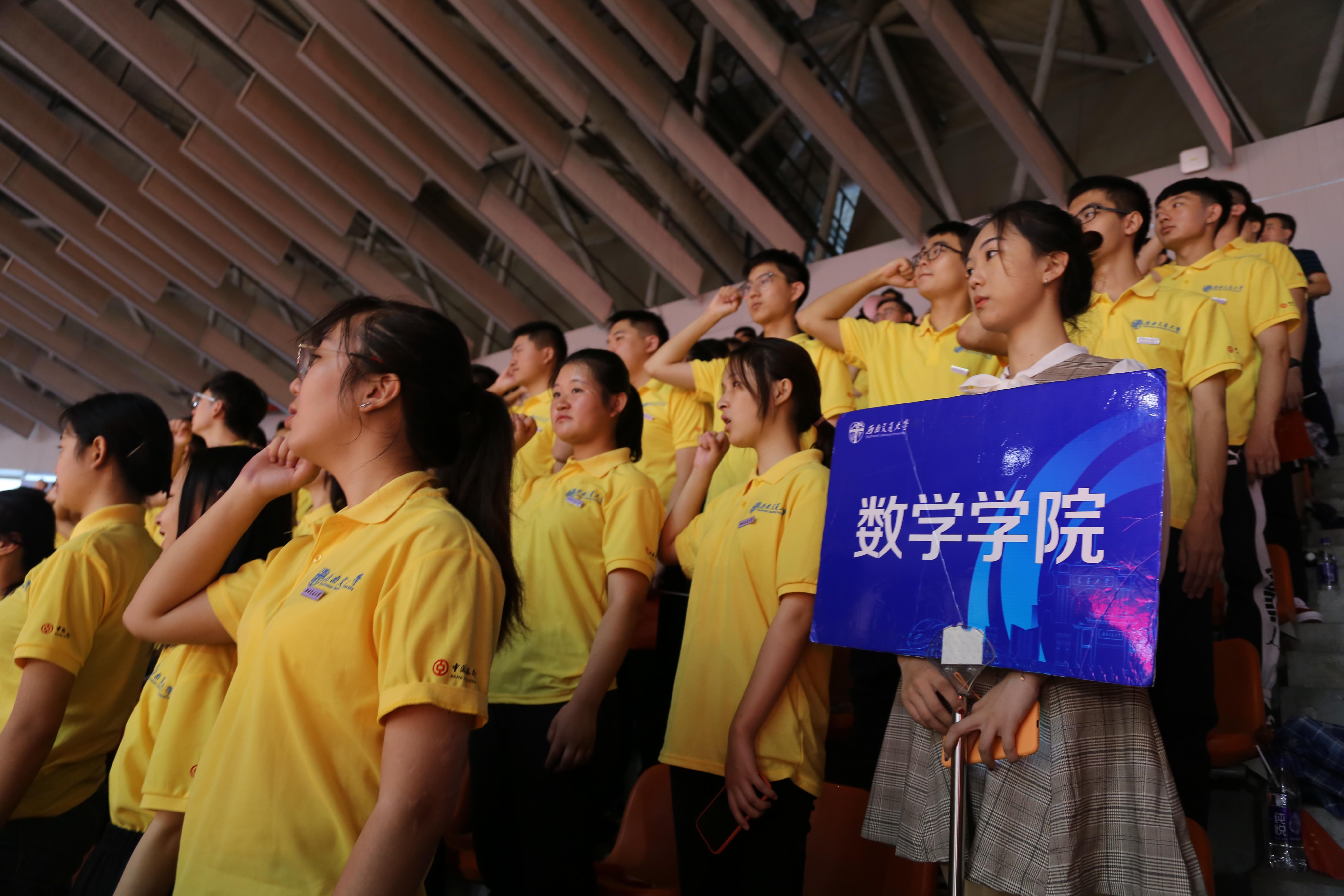 学子精神饱满,意气风发,“百年交大,金牌数学”的口号响彻会场。2019级新生开学典礼正式开始,全体人员面向国旗奏唱国歌,严肃恢弘,气势磅礴。
