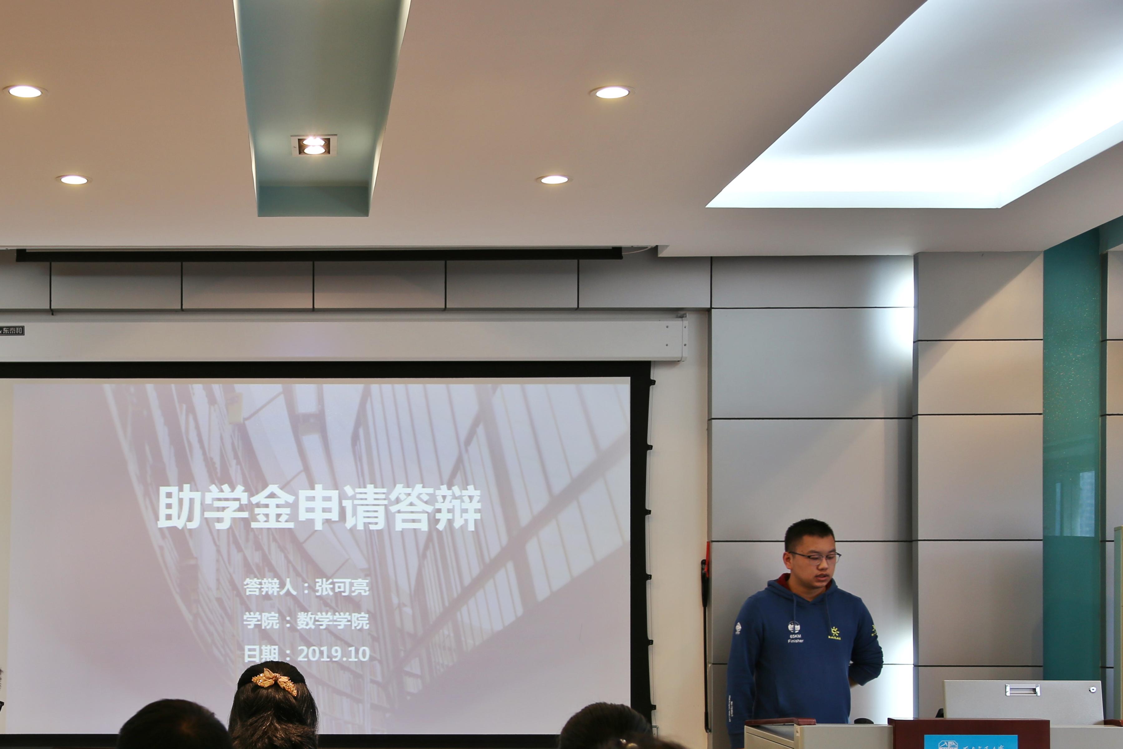 首先进行的是黄山教育助学金的答辩,来自应数专业的16级张可亮和17级刘雪丹上台答辩。他们从学习工作、兴趣爱好、生活实践等方面进行展示,向评委和在场同学们展现了德智体美劳全面发展的优秀综合实力!