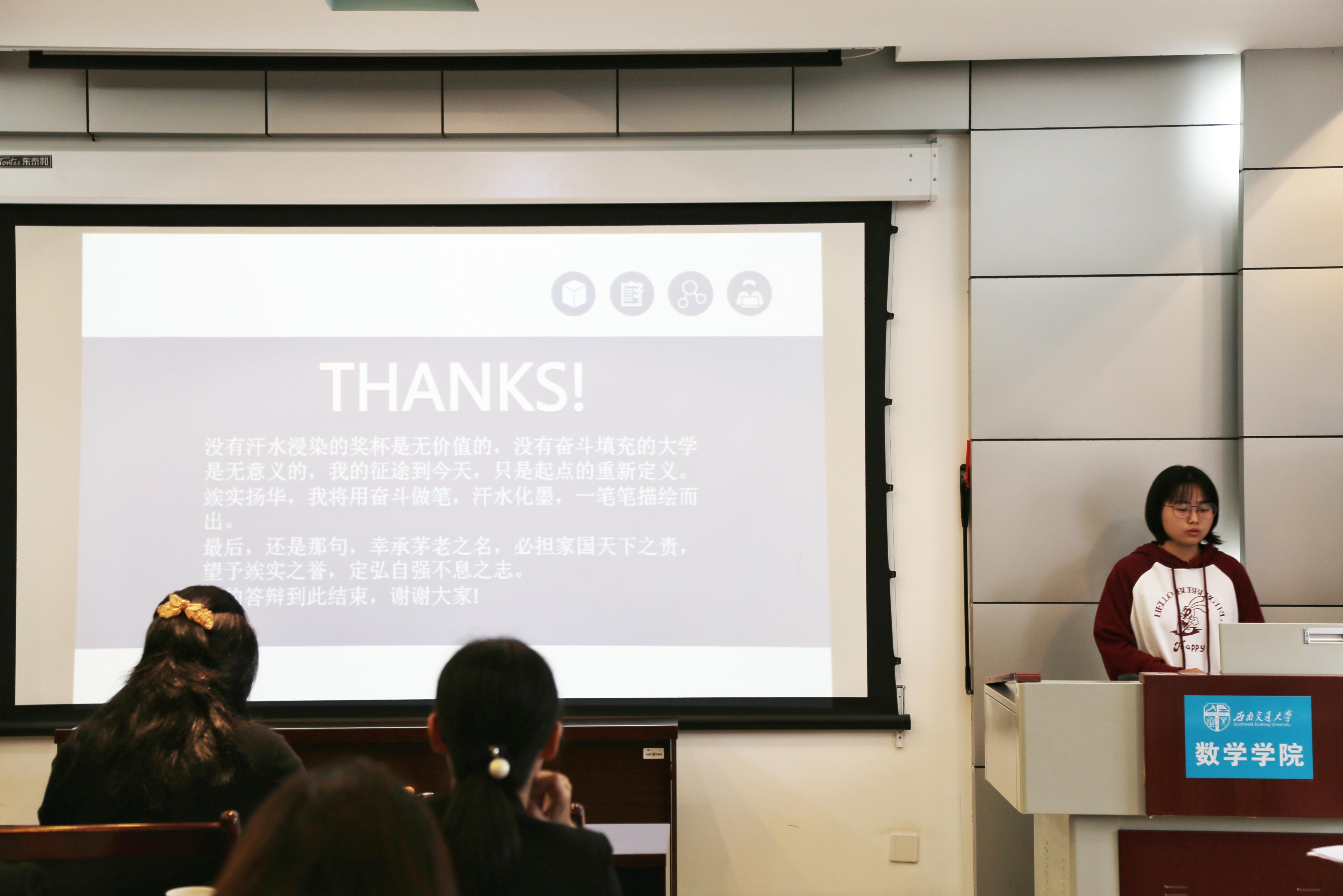 紧接着进行的是省级优秀本科毕业生的答辩。由罗江毅,周小兰两位同学上台答辩。两位同学均以优异成绩获得保研资格,除学业成绩,他们还在科研竞赛、学生工作、社会实践等多方面全方位地展现了自我,充分体现了交大数学人“竢实扬华,自强不息”的精神,为各年级同学做出优秀榜样!