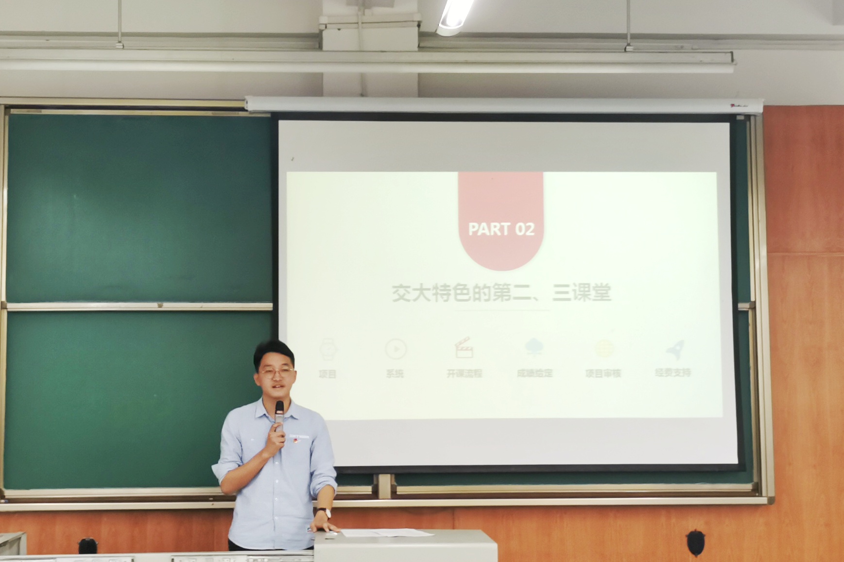周义杰同学向大家介绍了我校第二、三课堂的基本要求以及特色。周义杰同学首先一丝不苟地阐述了第二、三课堂的成绩单制度及其内容组成,使同学们初步了解了第二、三课堂的重要性。然后,周义杰同学结合自身选课实例和经验,向同学们详细地介绍了我校第二、三课堂的特色,让同学们对课程内容及特点有了更清晰的认识。最后,周义杰同学现场解答同学们对第二、三课堂的相关疑惑。