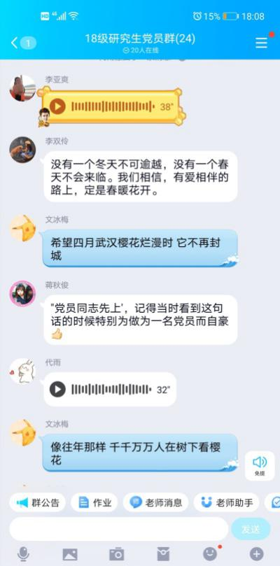 随后,全体党员结合视频及会议主题发表了自己的看法。宣传委员文冰梅推送了关于“钟南山院士领誓,广东战‘疫情’一线医护人员火线入党”的视频,她强调:“党中央对这次疫情防控及时有效的措施对我们来说是个强心剂。”组织委员蒋秋俊表示:“在这次疫情中,各级党员都坚守在抗疫一线,牢固增强“四个意识”、坚定“四个自信”、做到“两个维护”、坚决服从安排,全力以赴做好防疫工作,充分发扬了党员的带头作用。”党员李亚爽,预备党员夏丹、刘乾玉则鼓励大家说:“我们相信中国人民齐心协力的力量,我们也相信祖国的专家团队能够快速攻克病毒难关,我们的难关终将过去,因为没有什么能把我们炎黄子孙打倒!我们是最棒的!”