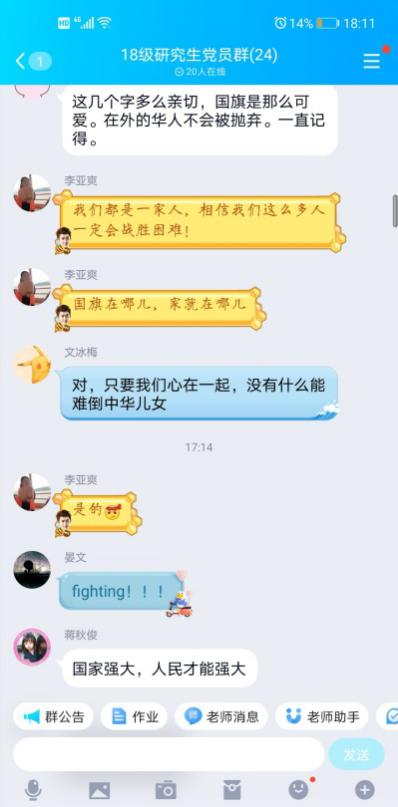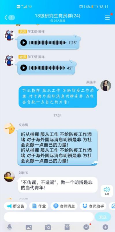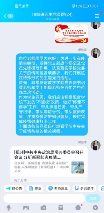 2018级研究生党支部召开疫情防控线上主题党日活动。本次活动以“守望相助,共克时艰,坚决打赢疫情防控阻击战”为主题,依托QQ群聊平台开展,澳门六合彩开奖结果