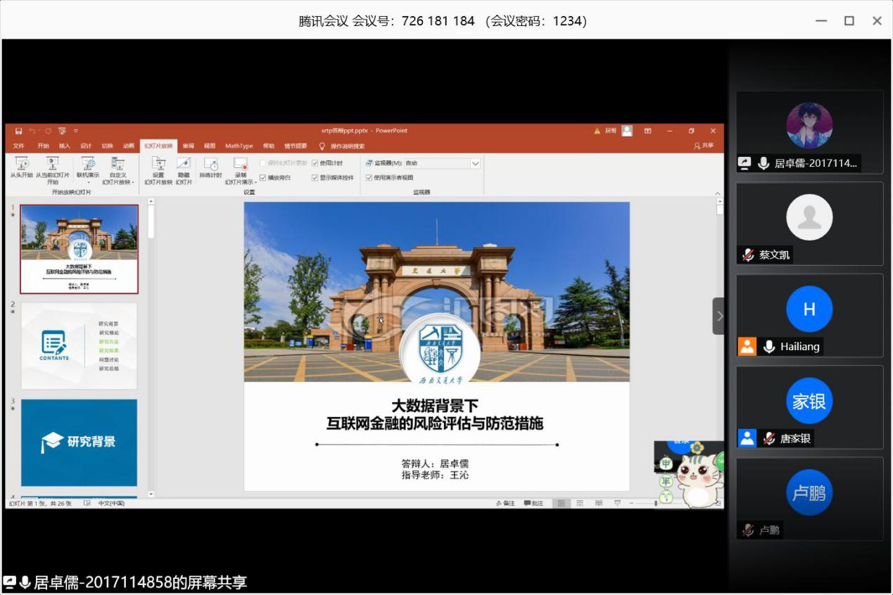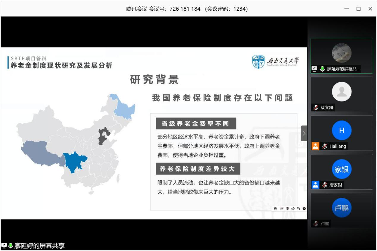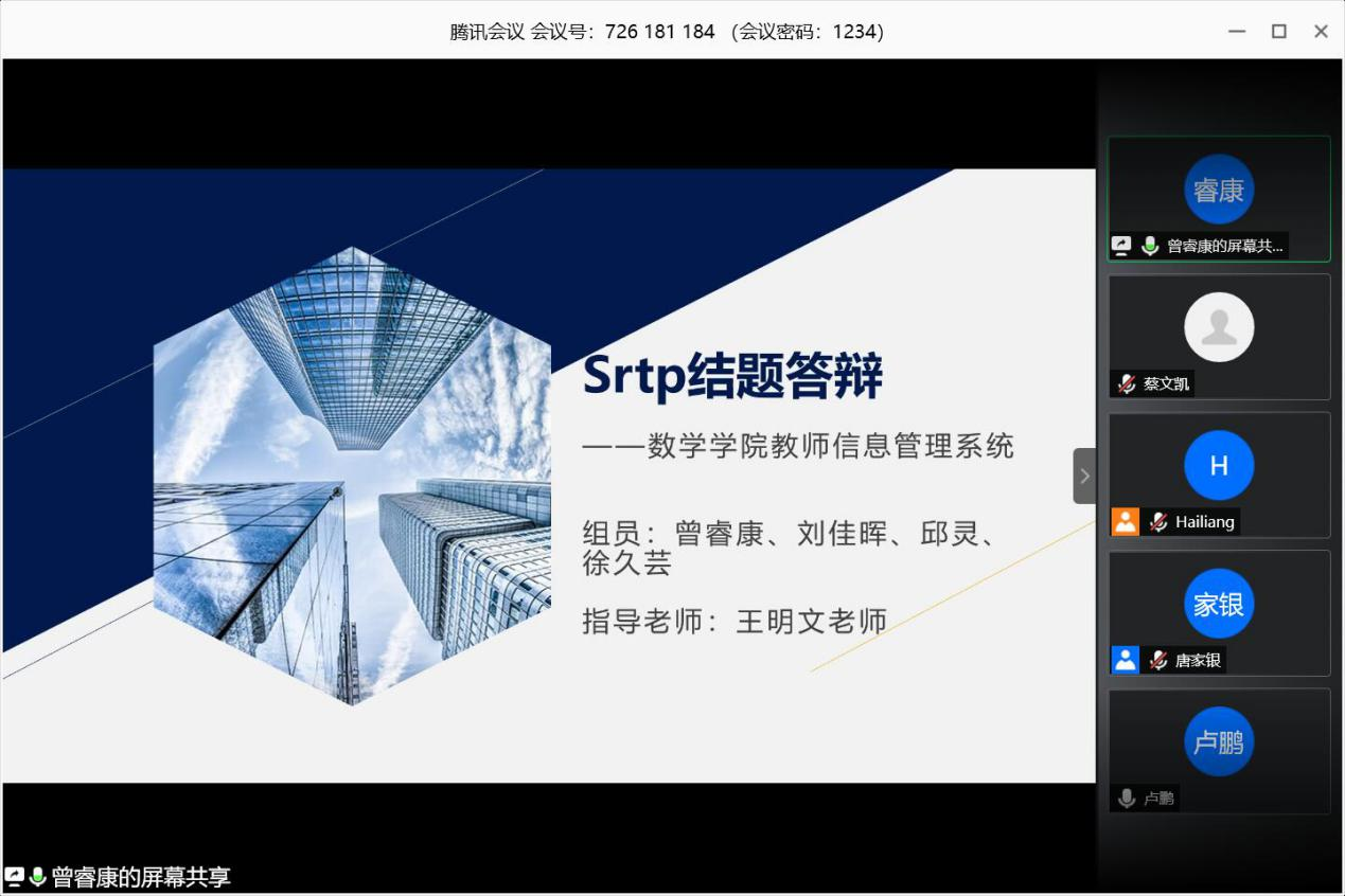 2019年度大学生科研训练项目(SRTP)结题验收答辩会于线上准时进行。此次答辩会的结题检查领导小组由王璐老师担任组长,潘小东老师担任副组长,赵海良、唐家银、刘品、梁涛老师等作为组员。全体参会人员准时进入会议参加答辩。