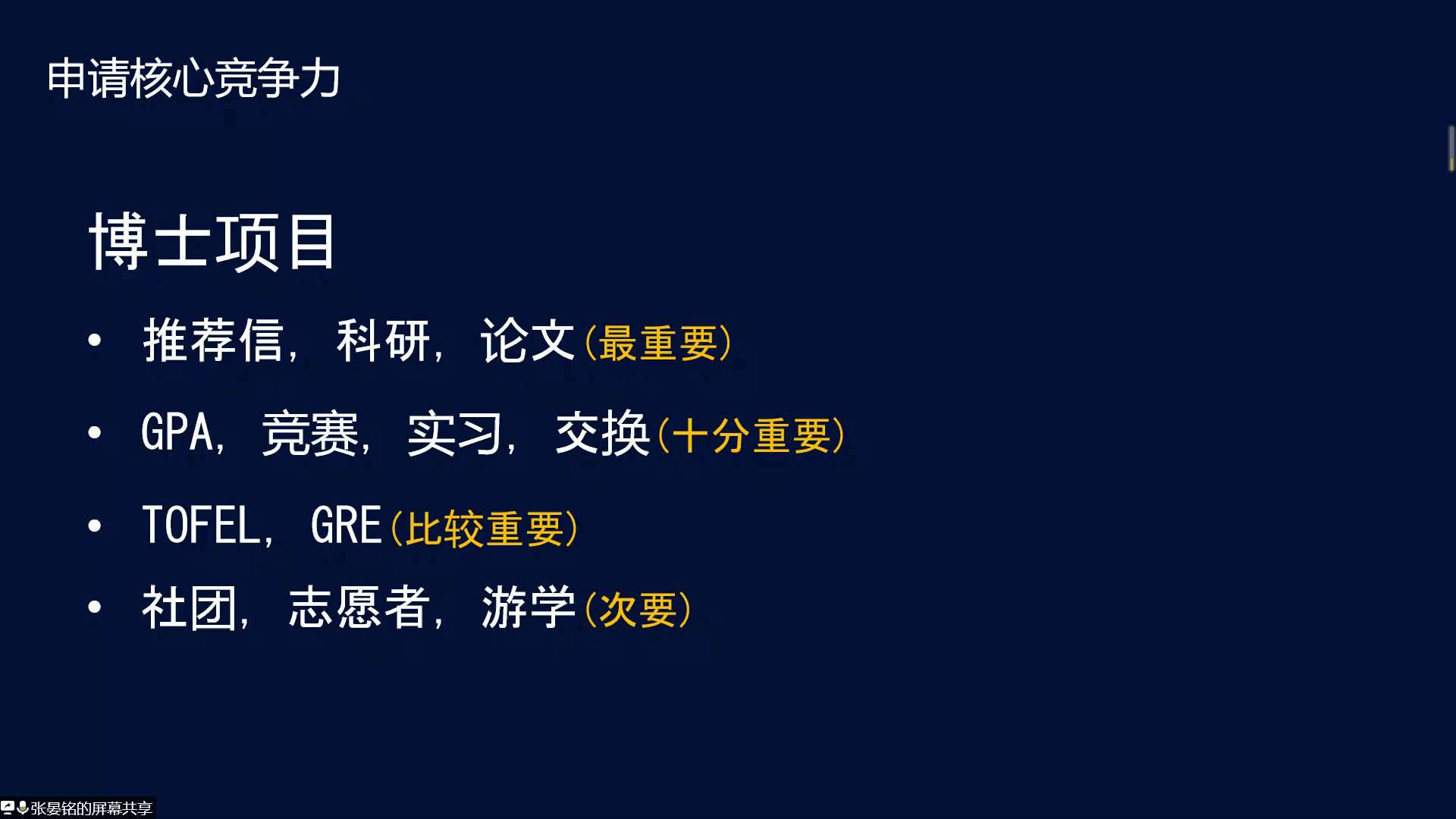 之后,即将前往美国纽约州立大学石溪分校留学的张晏铭同学与同学们分享了赴美留学的经验。首先,从申请条件入手,他认为学生的核心竞争力首先是GPA、TOFEL和GRE,其次是科研、竞赛、实习、交换经历,最后是学生组织、社团、志愿者以及游学等活动经历。最后张同学介绍了选择学校、专业以及出国前的准备事项。