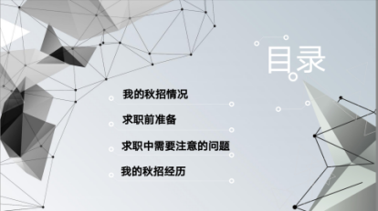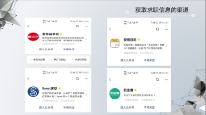 第二位进行分享的是杨嘉琪同学。她首先展示了自己秋招求职拿到的各种offer,讲述了自己关于工作方向的认识和理解。接着,杨同学分享了提供求职信息的公众号,同学们可以根据自己的目标多渠道地寻找合适的工作。