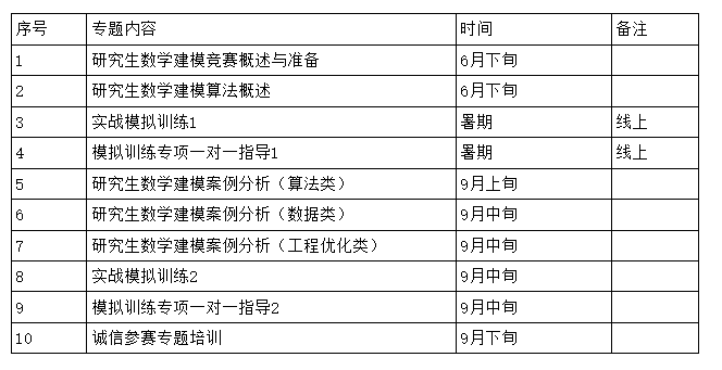 为了助力同学们更好地参赛,西南交通大学研究生数学建模指导团队根据同学们的报名情况,拟安排如下培训及训练: