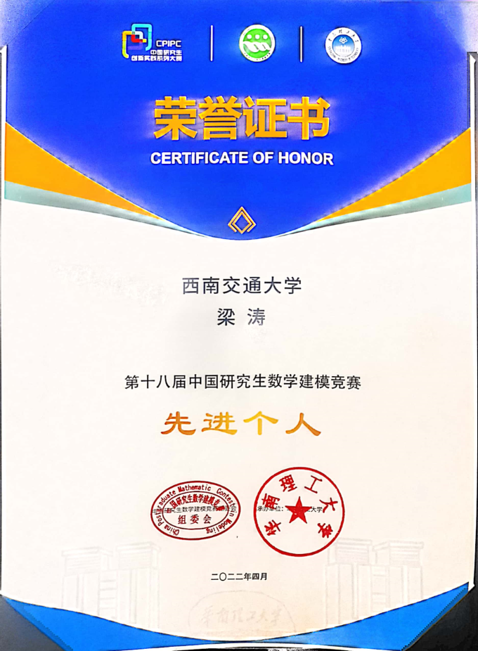 梁涛,女,副教授,公共数学教学研究部主任。长期从事本科生、研究生数学建模相关工作,其中指导学生共获得国家一等奖8项,二,三等奖40余项、全国大学生数学建模竞赛最高奖“高教社杯”1项,承担高教社杯四川赛区及华为杯全国研究生数学建模竞赛阅卷工作。2017年获全国大学生数学建模优秀指导教师奖、第十八届中国研究生数学建模“先进个人”荣誉称号。