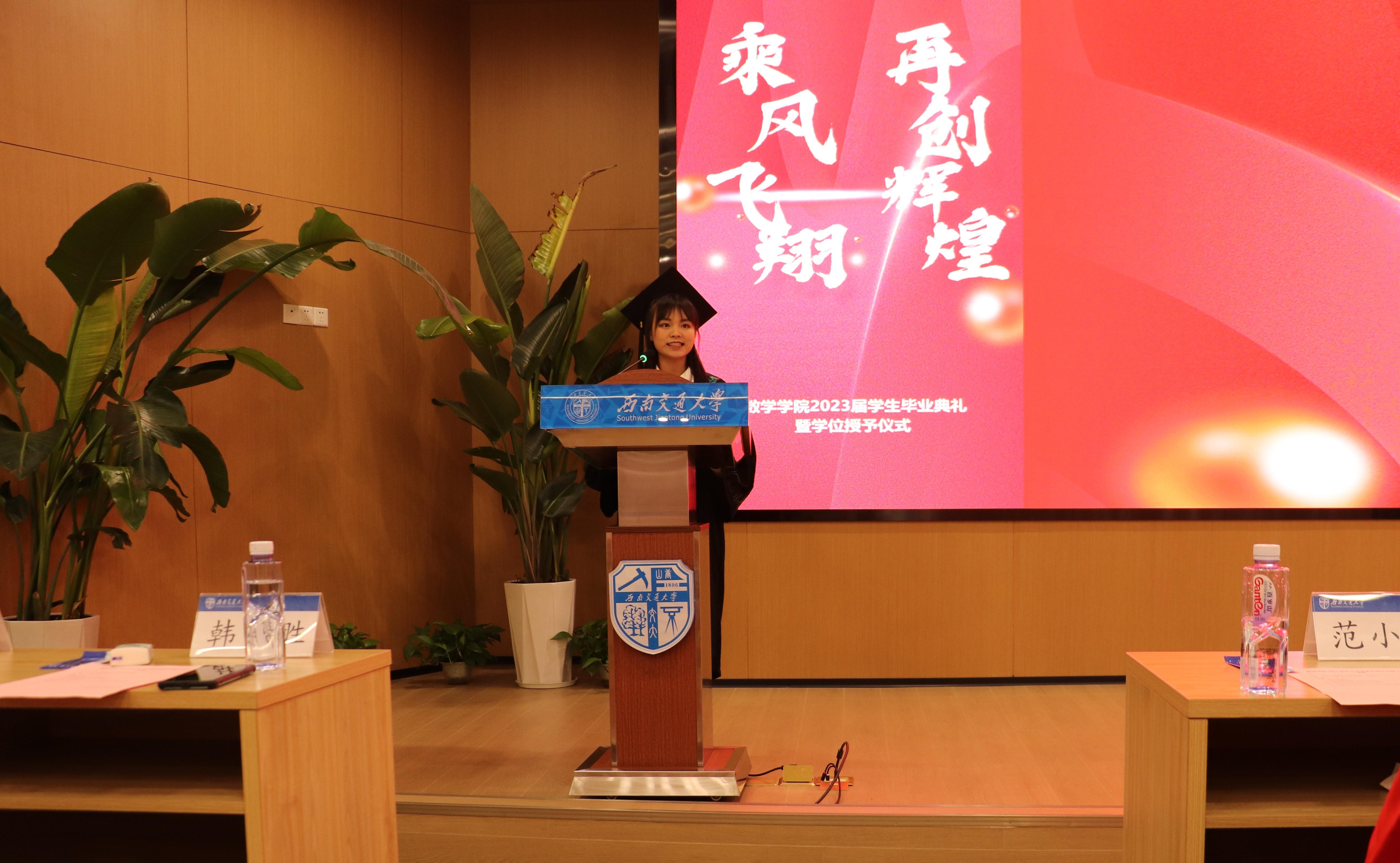 离别之际,杨晗院长祝愿同学们在新的赛道上跑出加速度,书写出更加绚烂多彩的篇章。同时,杨晗院长还叮嘱了同学们三点:一为“立青矜之志,履践致远”,要心系“国家事”、肩扛“国家责”,要以国家富强、人民幸福为己任,胸怀理想,志存高远;二为“行远自迩,踔厉奋发”,应秉持“竢实扬华,自强不息”的交大精神,在实践中增长知识、锤炼品格,以真才实学服务人民,以创新创造贡献国家;三为“奋楫笃行,臻于至善”,要学会感恩伟大的祖国、感恩伟大的时代,感恩陪伴多年的母校,感恩辛勤付出的老师,把青春奋斗融入到党和人民事业中,为国家发展聚能、为民族复兴蓄力。他提到,新时代青年将接过先辈手中的接力棒,坚定理想信念,从“国之大者”中寻找方向,扛起这份报效祖国的责任。杨晗院长表示,交大永远是同学们最温暖的港湾,交大数院也期盼与各位同学共同走向辉煌!最后,杨晗院长再次向2023届毕业生们致以诚挚的祝贺。