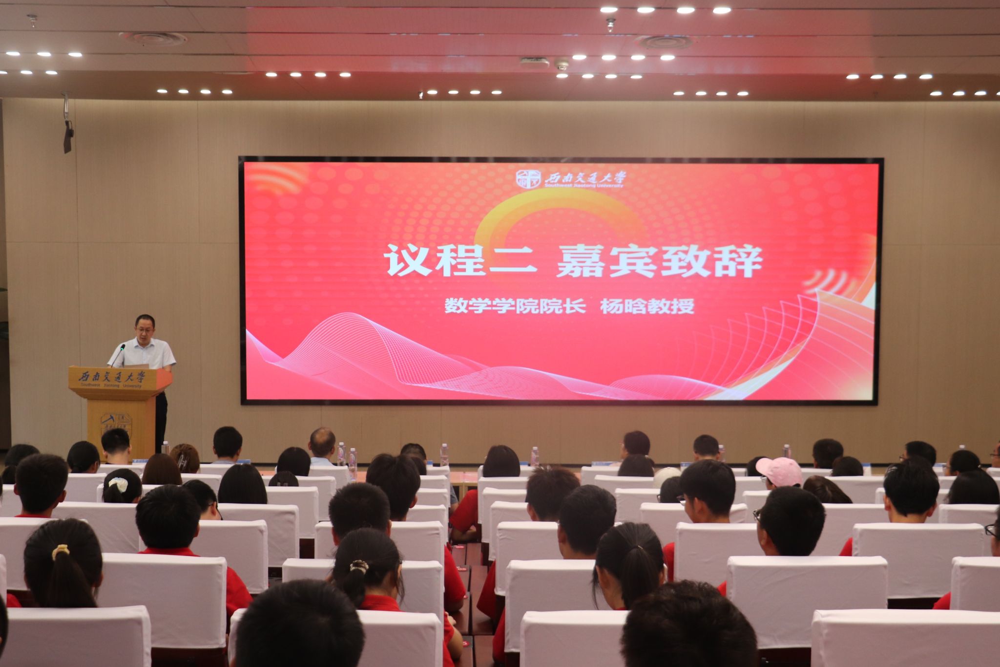 院长杨晗教授致辞,他对2024级新生的到来表示热烈欢迎。杨晗院长先向全体新生讲述了数学之美,数学之美在于严谨与精确、创新与发现,在数字化时代,数学以其独特的方式影响着世界的方方面面。他指出,我们要用数学的语言描绘世界,用数学的思维解决问题。随后,杨晗院长介绍了澳门六合彩开奖结果